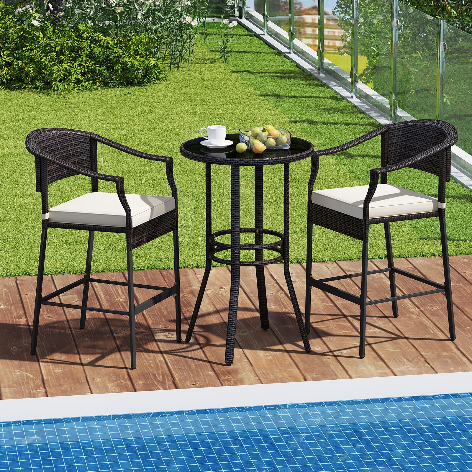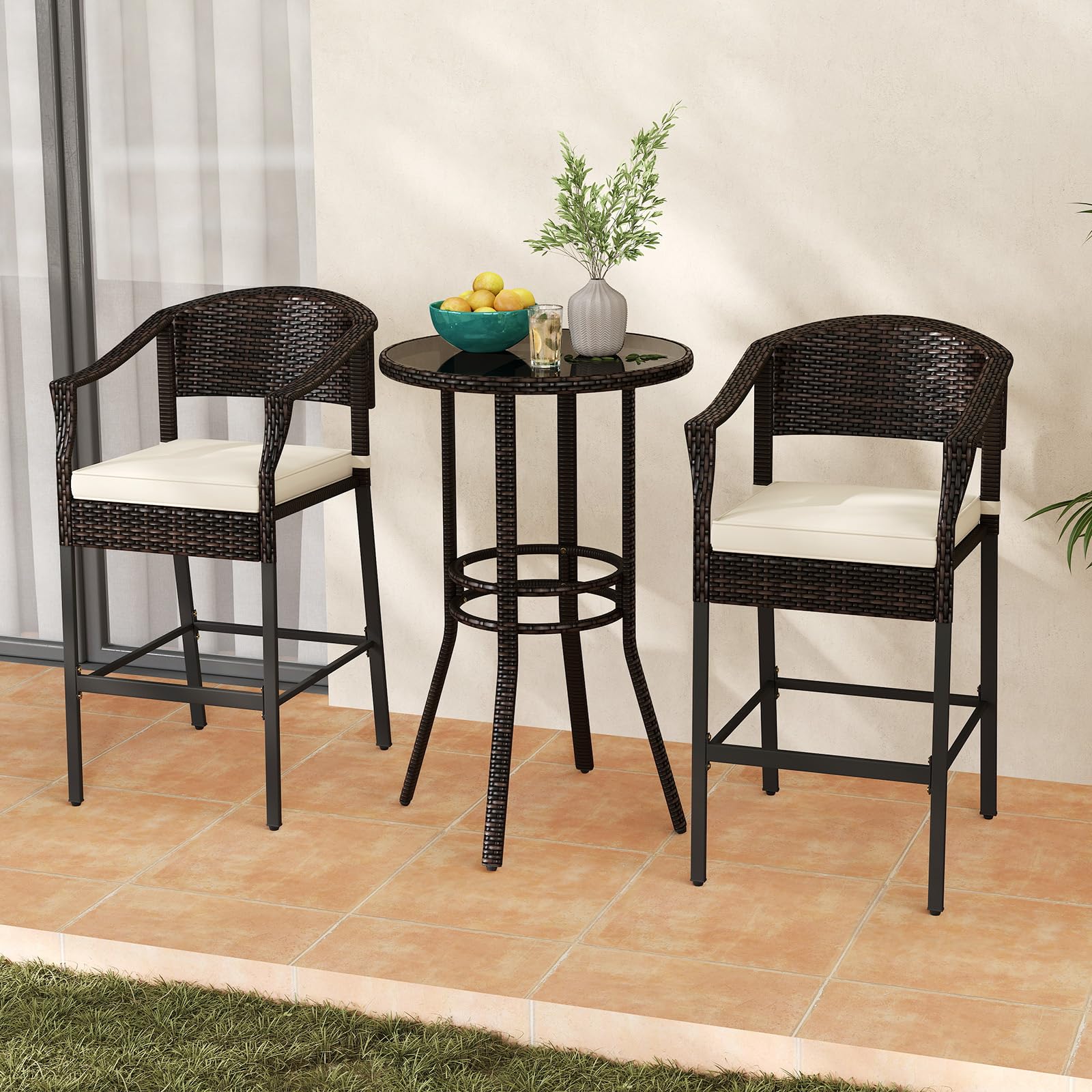 Crafted from well-woven PE rattan, this patio bar set showcases long-lasting elegance outdoors. The 2 ergonomically designed bar-height armchairs with cozy footrests and soft cushions will provide ultimate comfort. The round bar table, enhanced with a tempered glass top secured by suction cups, adds a touch of elegance to your outdoor gatherings. The heavy-duty metal frame with adjustable footpads ensures strong load capacity, making each bar chair to load up to 400 lbs. And the reinforced retaining rings make the bar table much sturdier. Ideal for any outdoor space, this bar set with exquisite details provides a wonderful setting for enjoying outdoor leisure time with your loved one.
