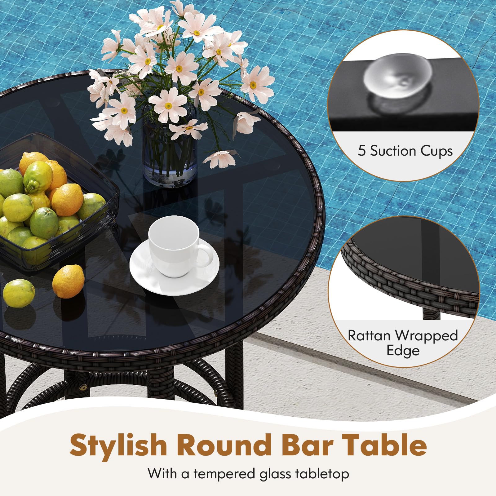 - Stylish Round Bar Table: The stylish bar table with a tempered glass tabletop will provide added elegance and convenience. The glass tabletop is fixed by 5 suction cups, promising stability. The rattan wrapped edge also ensures higher safety.