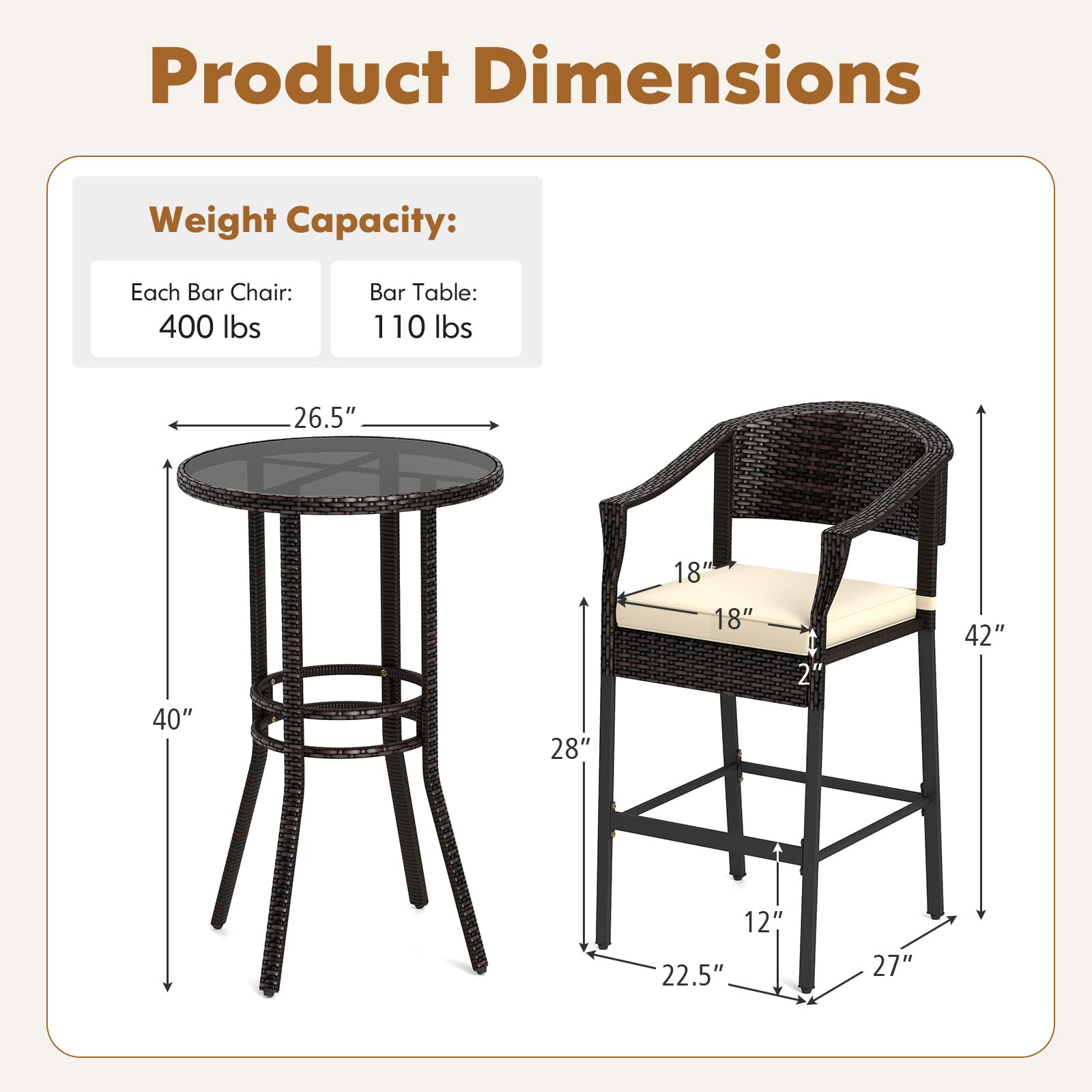 - Ideal Option for Relaxing: Whether it’s a sunny afternoon by the pool or a cool evening on the porch, this rattan bar set is the ideal choice for sipping beverages or enjoying meals. Dimension of bar chair: 27” x 22.5” x 42” (L x W x H). Dimension of bar table: 26.5” x 40” (Dia x H).