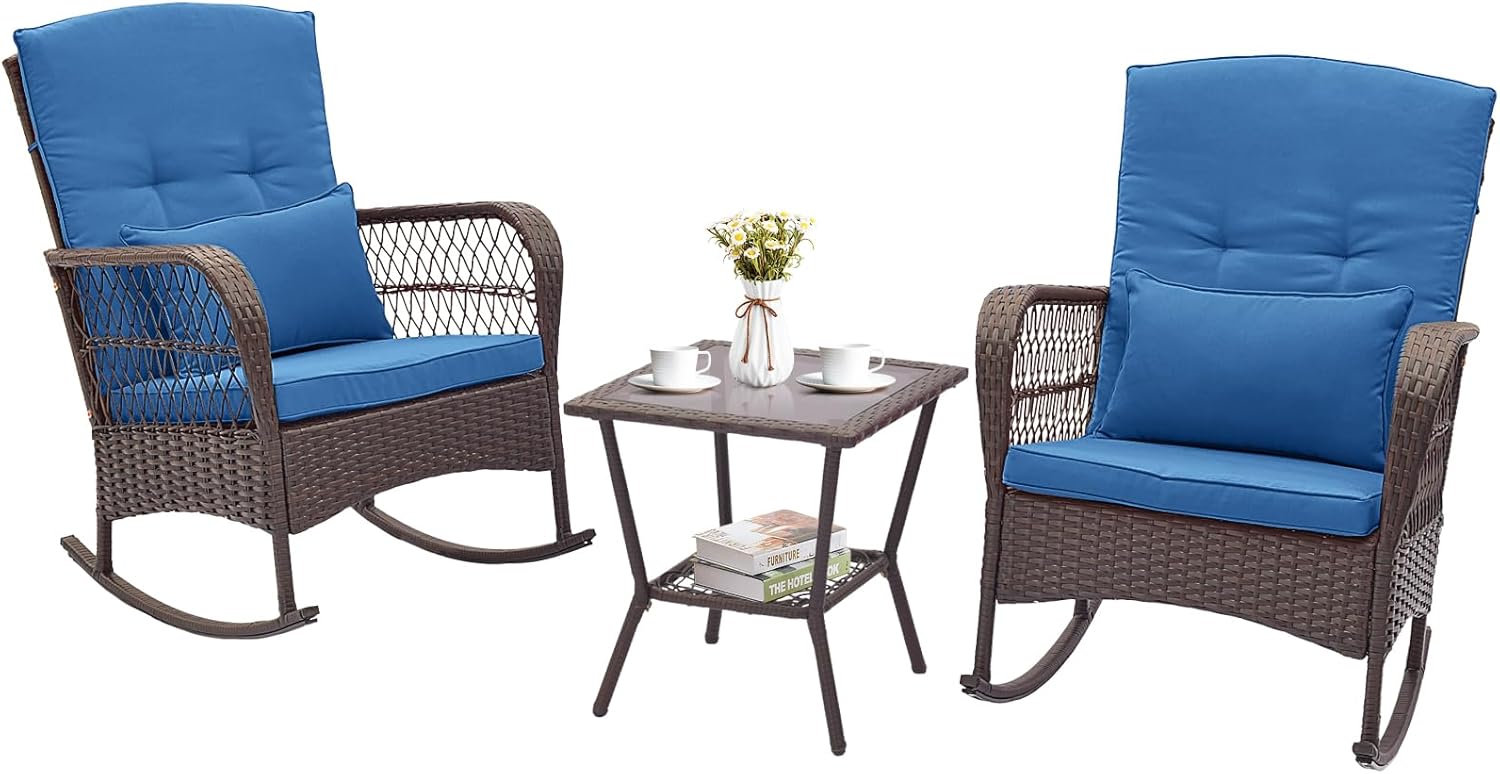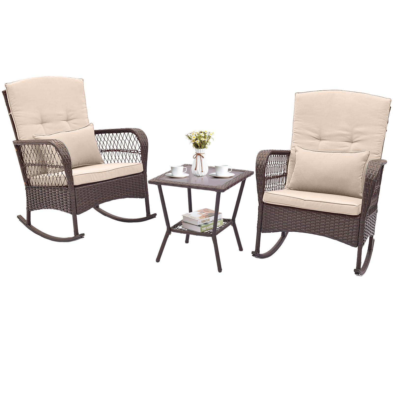 • Double-Tier Coffee Table: The patio rocking set is complete with an elegant coffee table, topped with sturdy tempered glass secured by 4 suction cups. The table is ideal for resting drinks, snacks, or your favorite reads as you unwind.