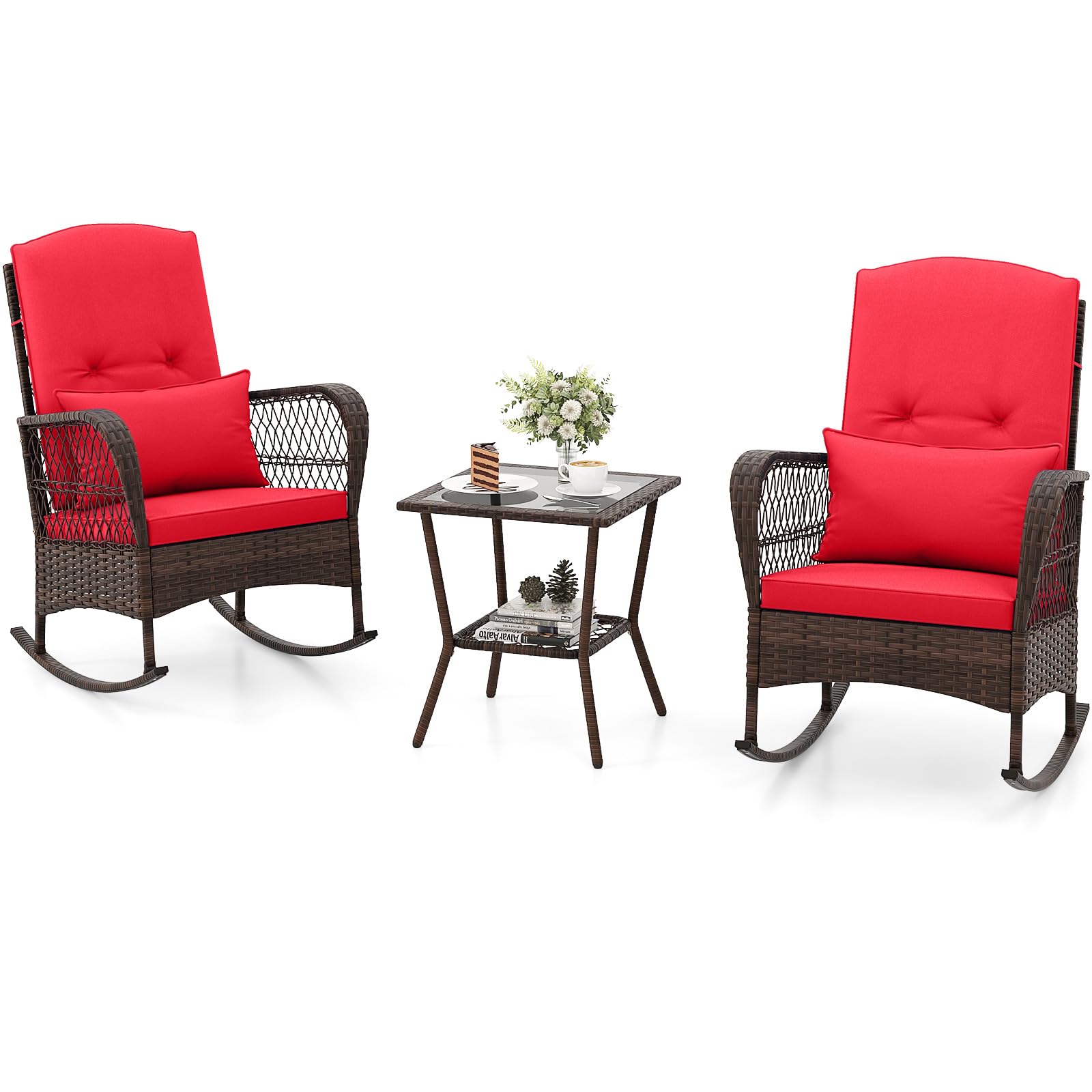 This rocking set includes 2 gently rocking chairs with non-slip rubber mats and stoppers for safety, and a double-tier coffee table with a tempered glass tabletop for durability and style. The rattan surface of the 3 pieces brings more elegance. Moreover, the comfortable cushions filled with high-density sponge offer you endless coziness. Elevate your patio or garden with this elegant wicker rocking set and turn your outdoor space into a serene retreat.