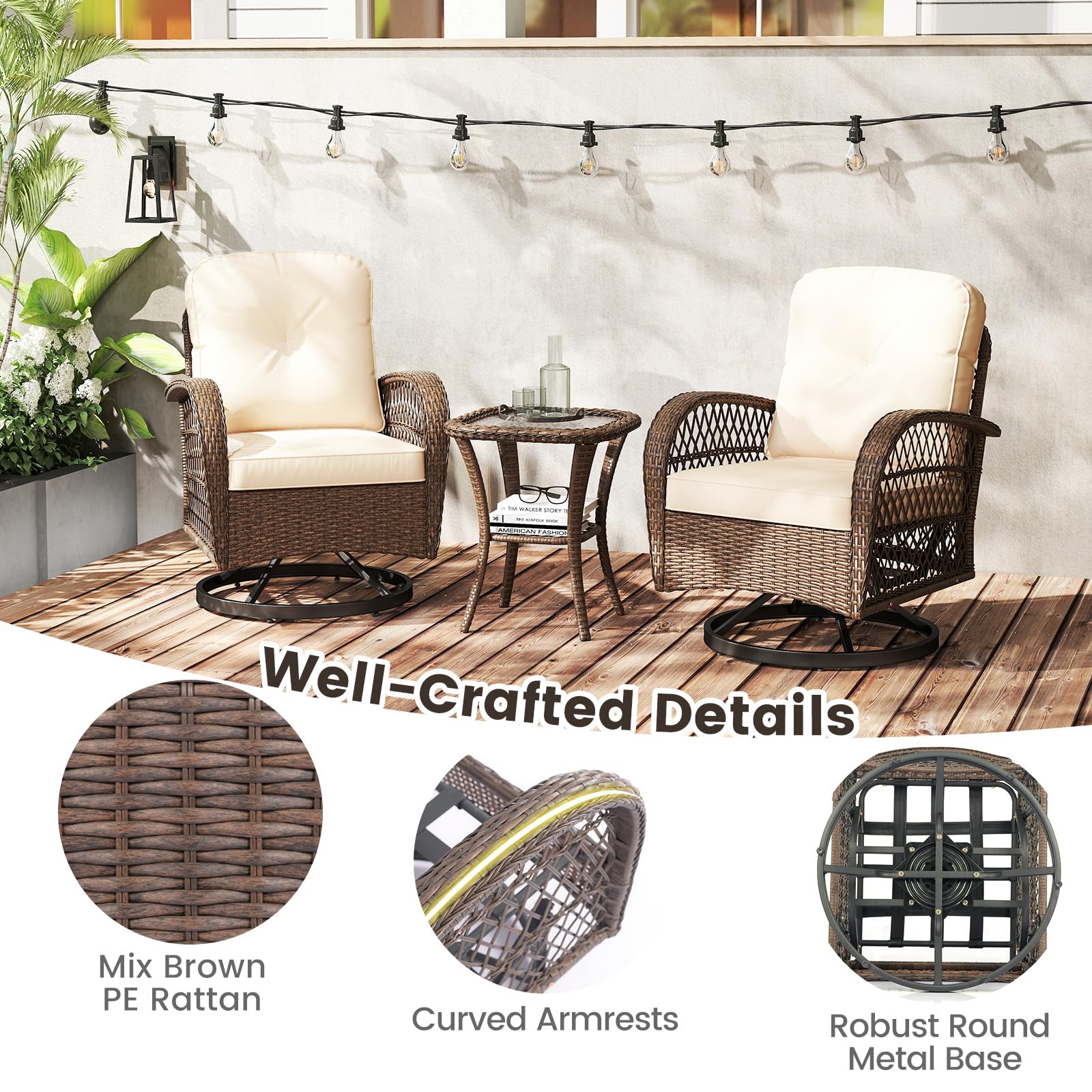 Upgrade your outdoor relaxing space with this 3-piece patio swivel rocker set, designed to combine comfort with style.