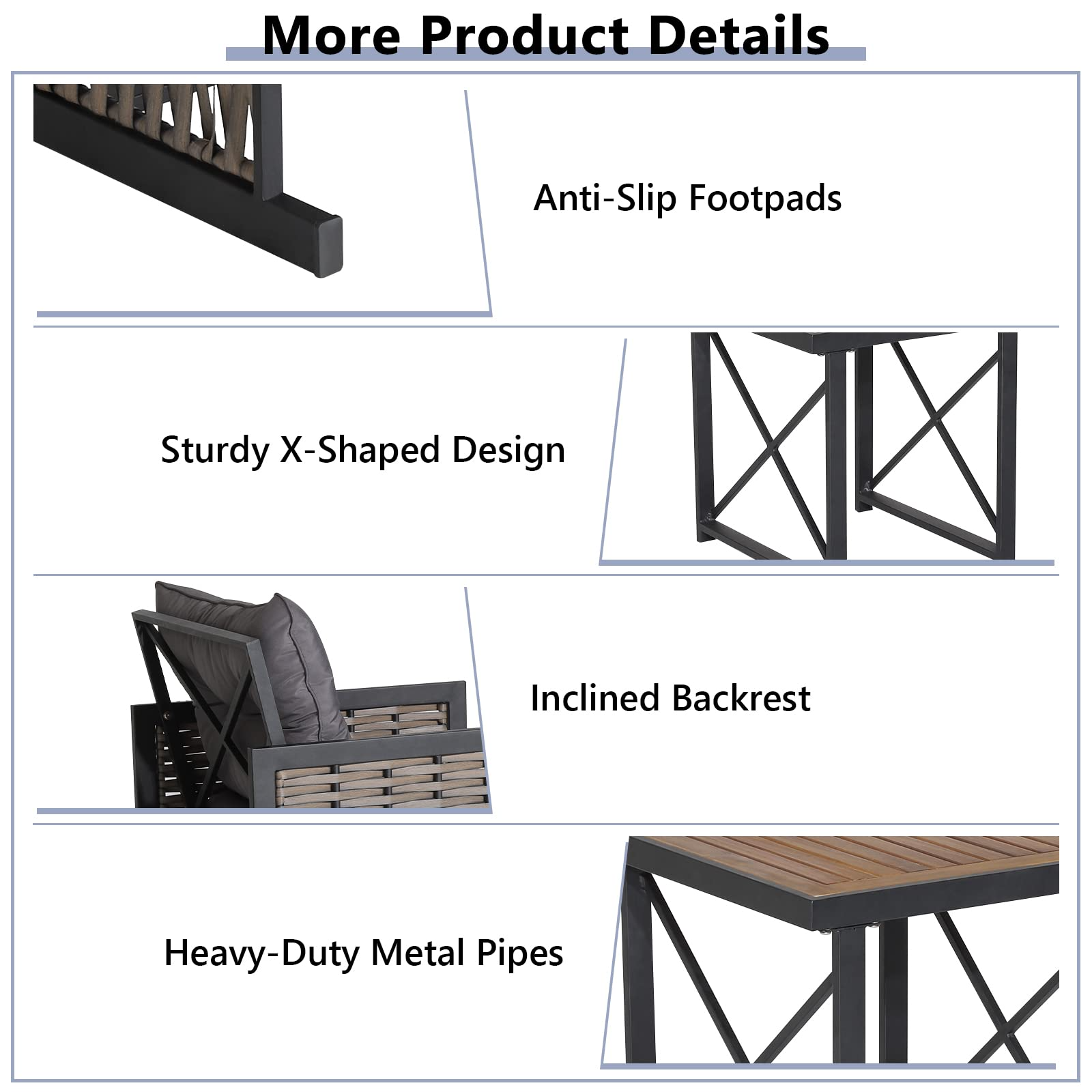 - Strengthened Metal Structure: Both the chairs and table feature heavy-duty metal frames for high stability, which are also powder-coated for rust resistance. The X-shaped design on the two sides of the table and the backrest of the seat highly strengthens the overall structure. Moreover, the anti-slip footpads protect the ground well and make the 3 pieces stand more stable.