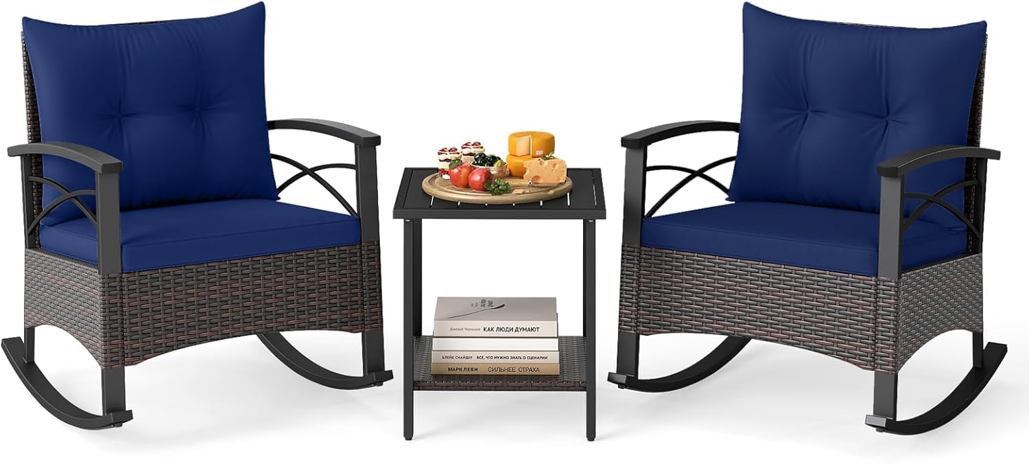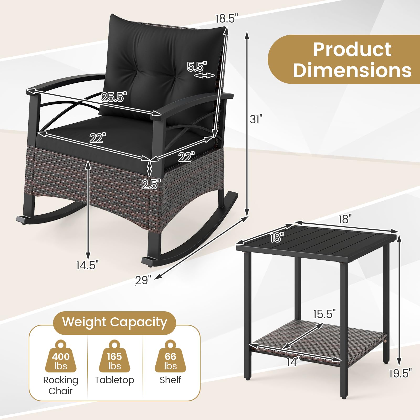 Combining sturdy metal rocking bases and appealing mix brown PE rattan, the rocking chair set offers lasting beauty and durability. Each rocking armchair features soft sponge-filled cushions for optimal coziness. And the acacia wood tabletops and armrests add natural charm and strength. Moreover, the 2-tier side table with rattan shelf makes drinks and snacks within reach. Elevate your outdoor living space effortlessly with this stylish and functional rocking chair set designed for both comfort and elegance.
