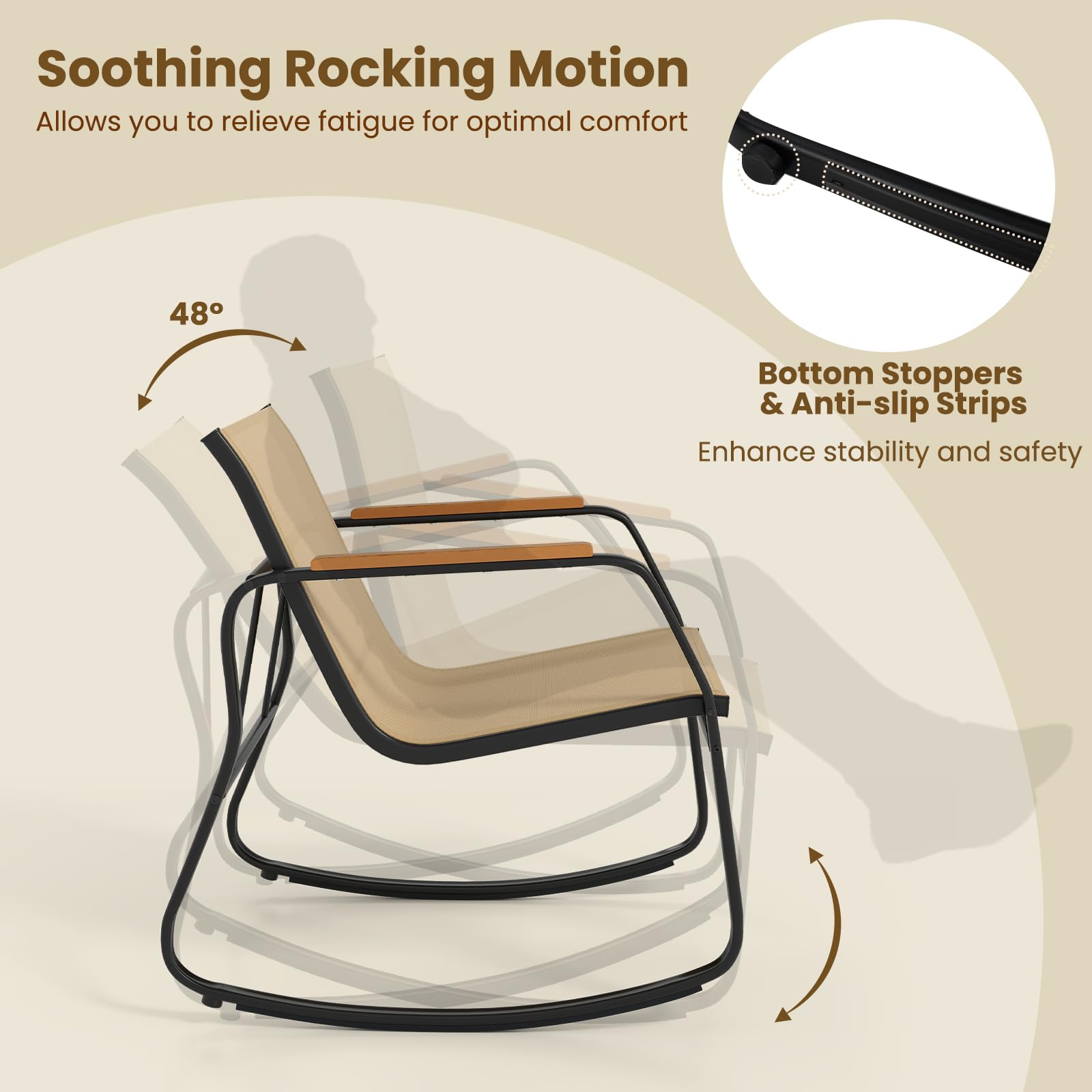 Experience the ultimate in relaxation with our 3-piece rocking chair set, featuring a soothing rocking motion to help you unwind after a long day. Thoughtful details include comfortable wood-like armrests, ergonomic backrest and breathable fabric for the ultimate experience. The set also includes a convenient coffee table with storage for your essentials. Built to last, the heavy-duty metal frames and tear-resistant fabric ensure durability and stability, supporting up to 330 lbs per chair. Whether on your front porch, backyard, or poolside, this charming bistro set adds a touch of elegance and comfort to any outdoor space. Relax in style with our versatile patio furniture set.