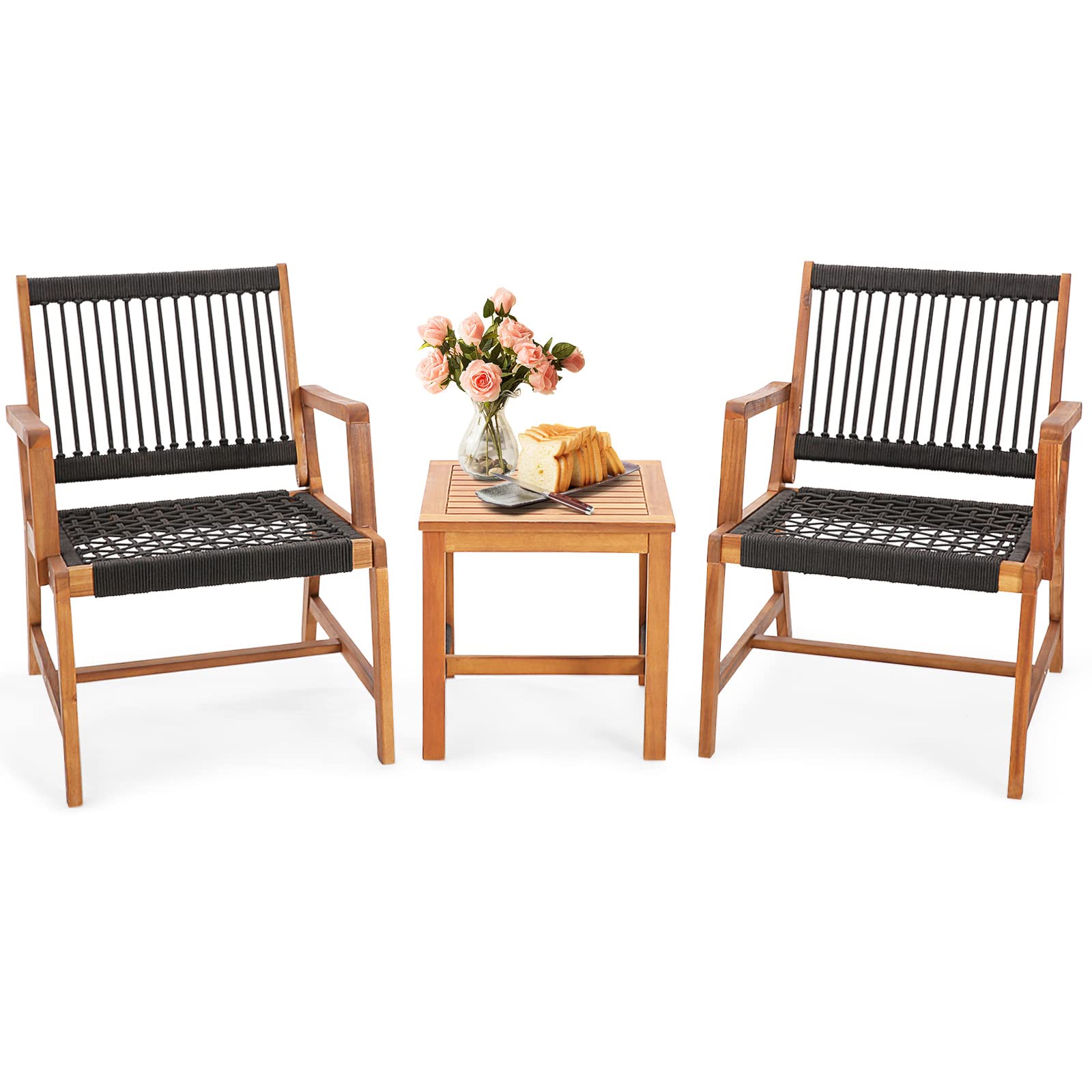 Tangkula 3 Pieces Acacia Wood Outdoor Furniture Set, All-Weather Rope Woven Bistro Set with Armchairs and Coffee Table