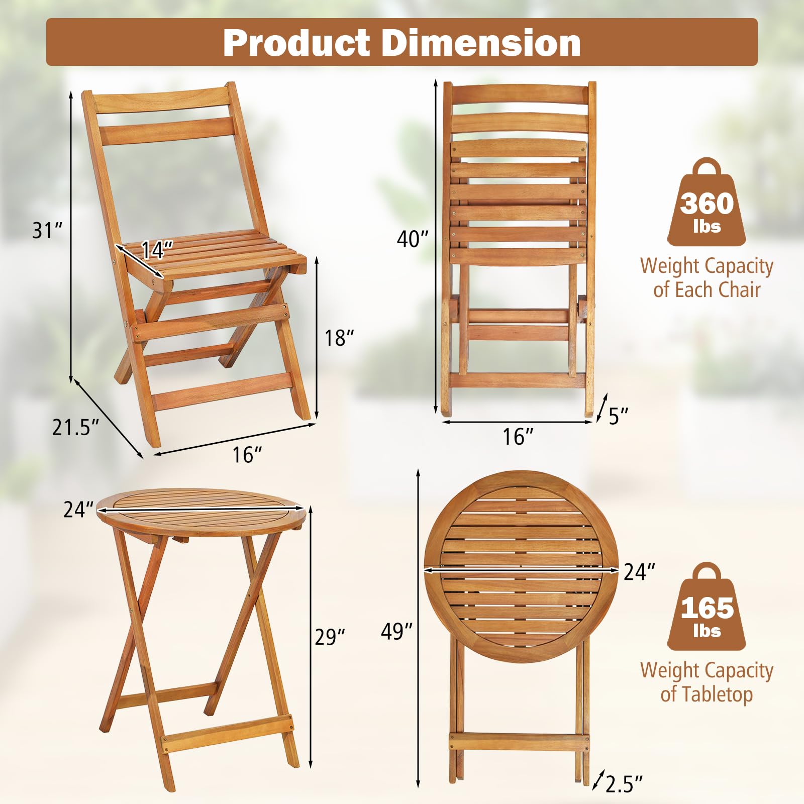 Tangkula 3 Pieces Folding Patio Bistro Set, Solid Acacia Wood Table and Chairs