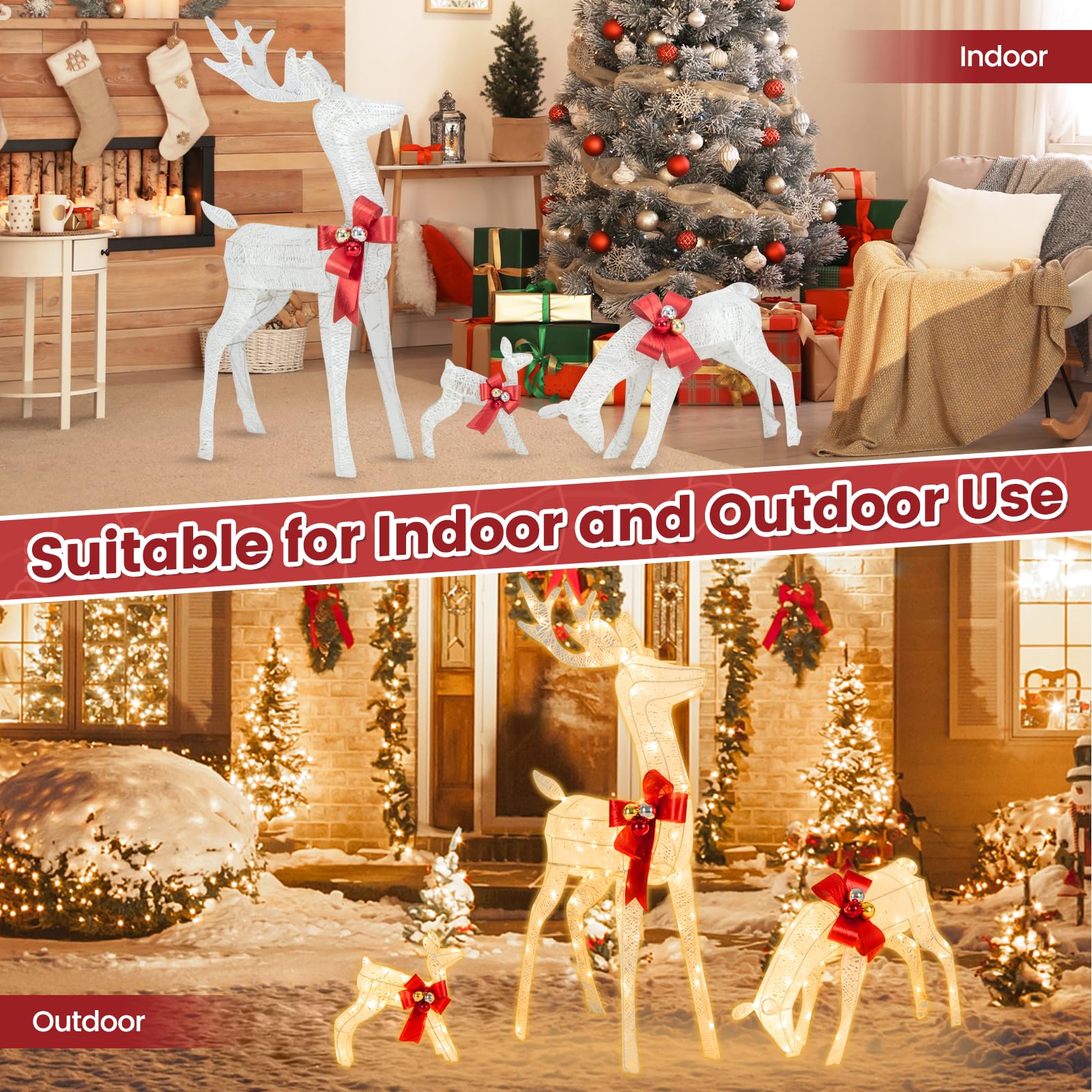 - Super Bright Built-in LED: 200 constant light beads and 30 flashing lights create a dazzling effect at night with our lighted reindeer family set. The included band adapter is easy to operate and comes with timing functions to give you effortless control over the lights.
