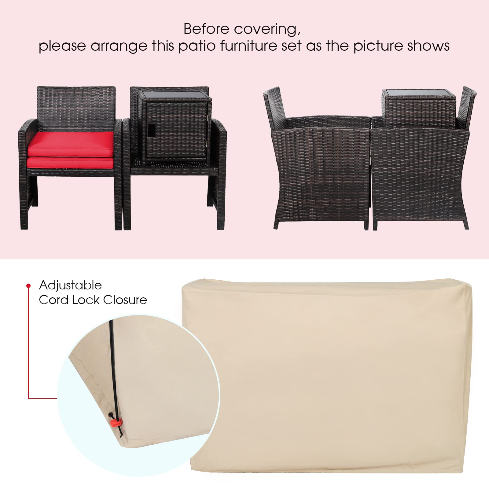 - Included Waterproof Cover: If you put this patio furniture set outside while wanting it looks brand new, you can cover the waterproof cover. There is an adjustable cord lock closure to fix the waterproof cover in position. Before covering, please arrange this patio furniture set as the picture shows. And the waterproof cover can be put on the storage table if you don??t need it.