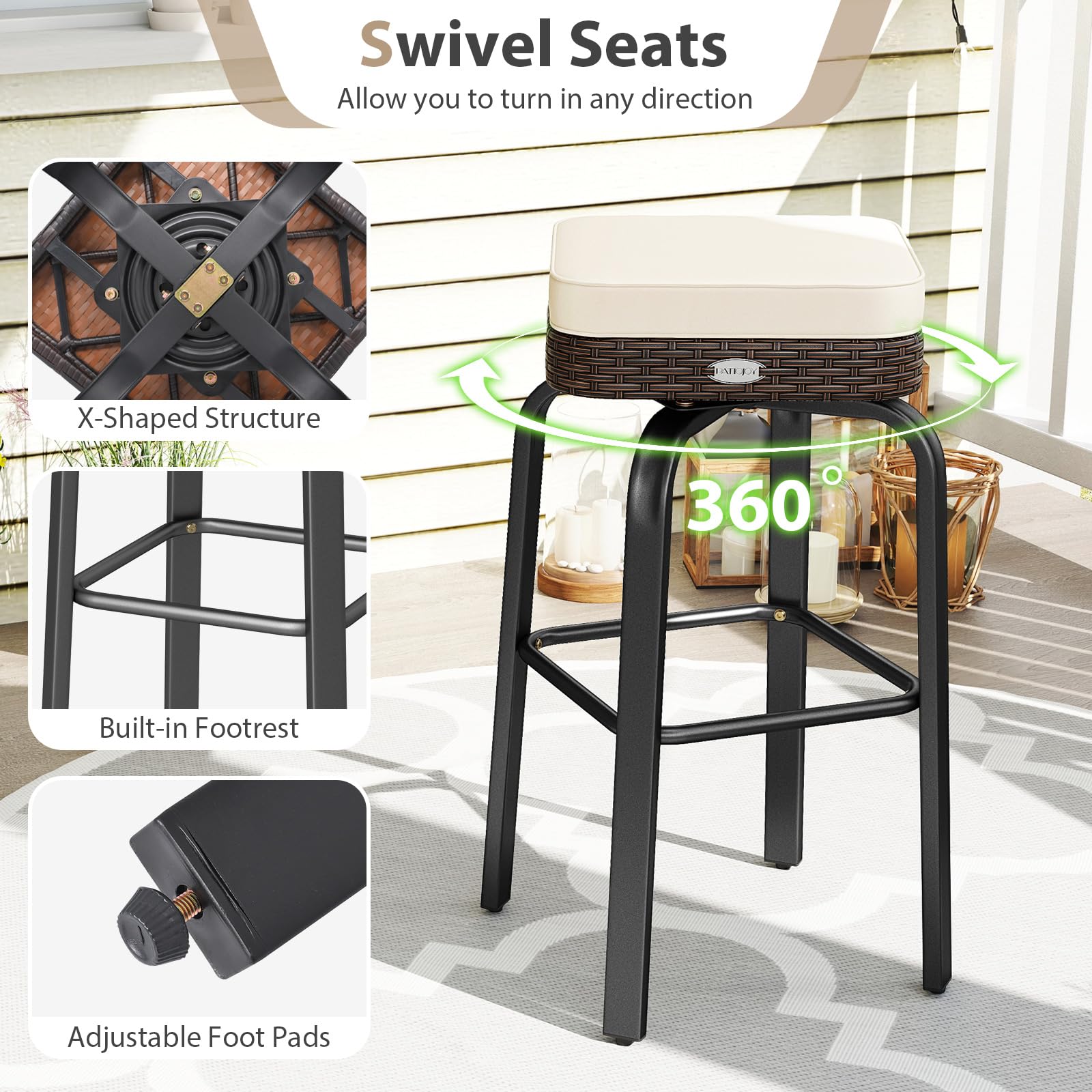 This 3-piece patio bar set blends elegance and durability, made with hand-woven PE rattan and heavy-duty metal tubes. Designed for your convenience, the patio bar chairs offer a 360° swivel function. Each chair is equipped with sponge-filled cushions secured by toggle fasteners, featuring removable and washable covers for easy cleaning. Complementing the seating is a tempered glass top table, safely attached with suction cups for holding meals and drinks. Additionally, the adjustable foot pads ensure the high top bistro set remains stable on uneven grounds, making it adaptable for patios, gardens, or poolside areas.