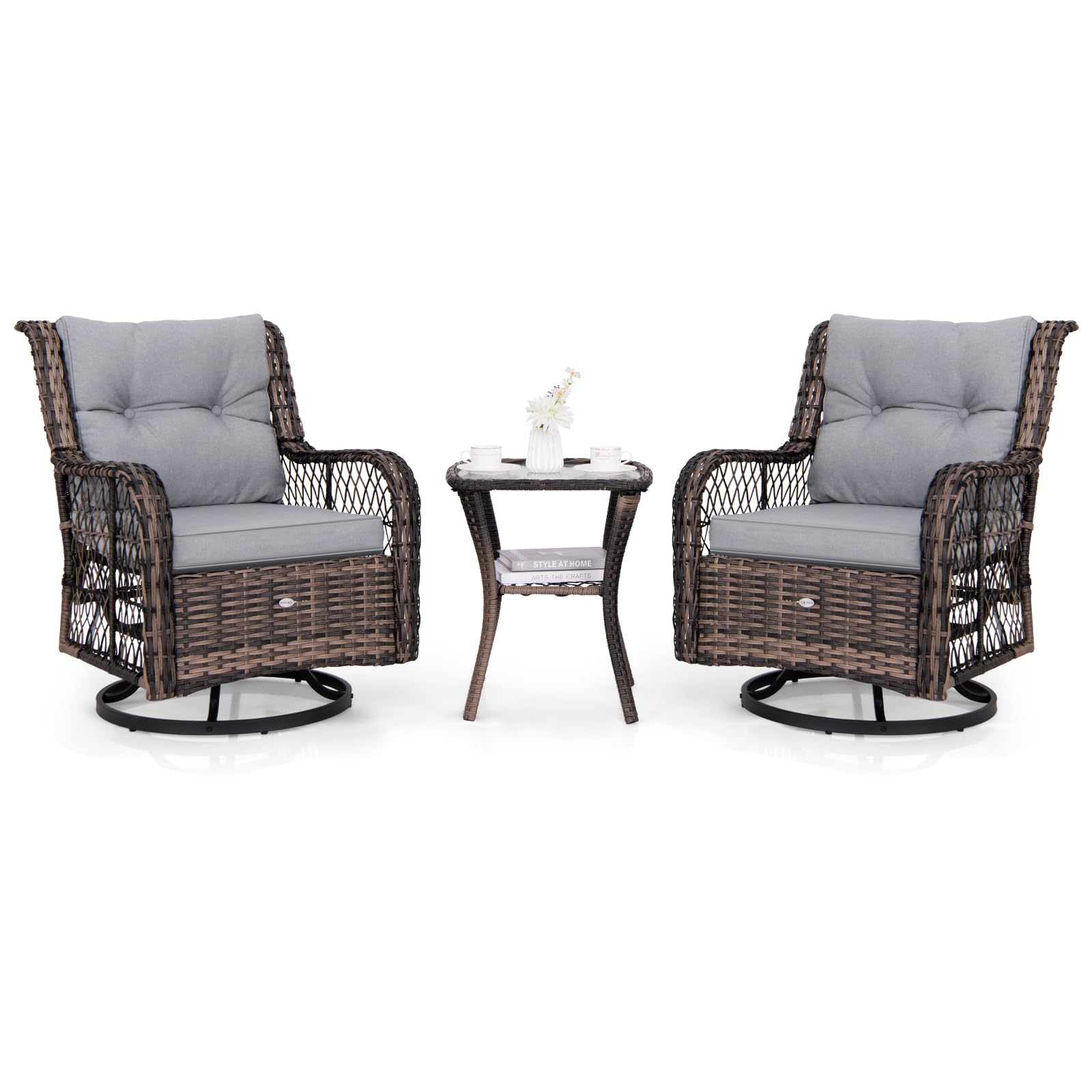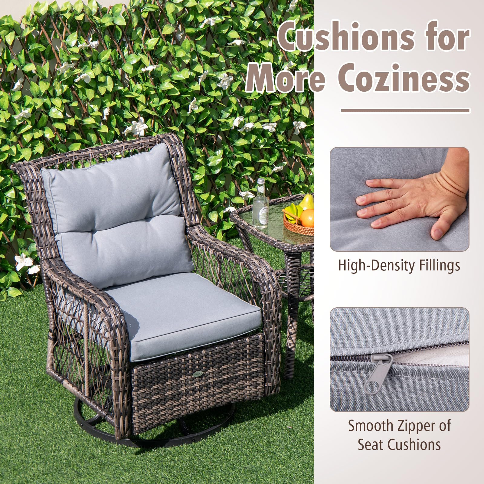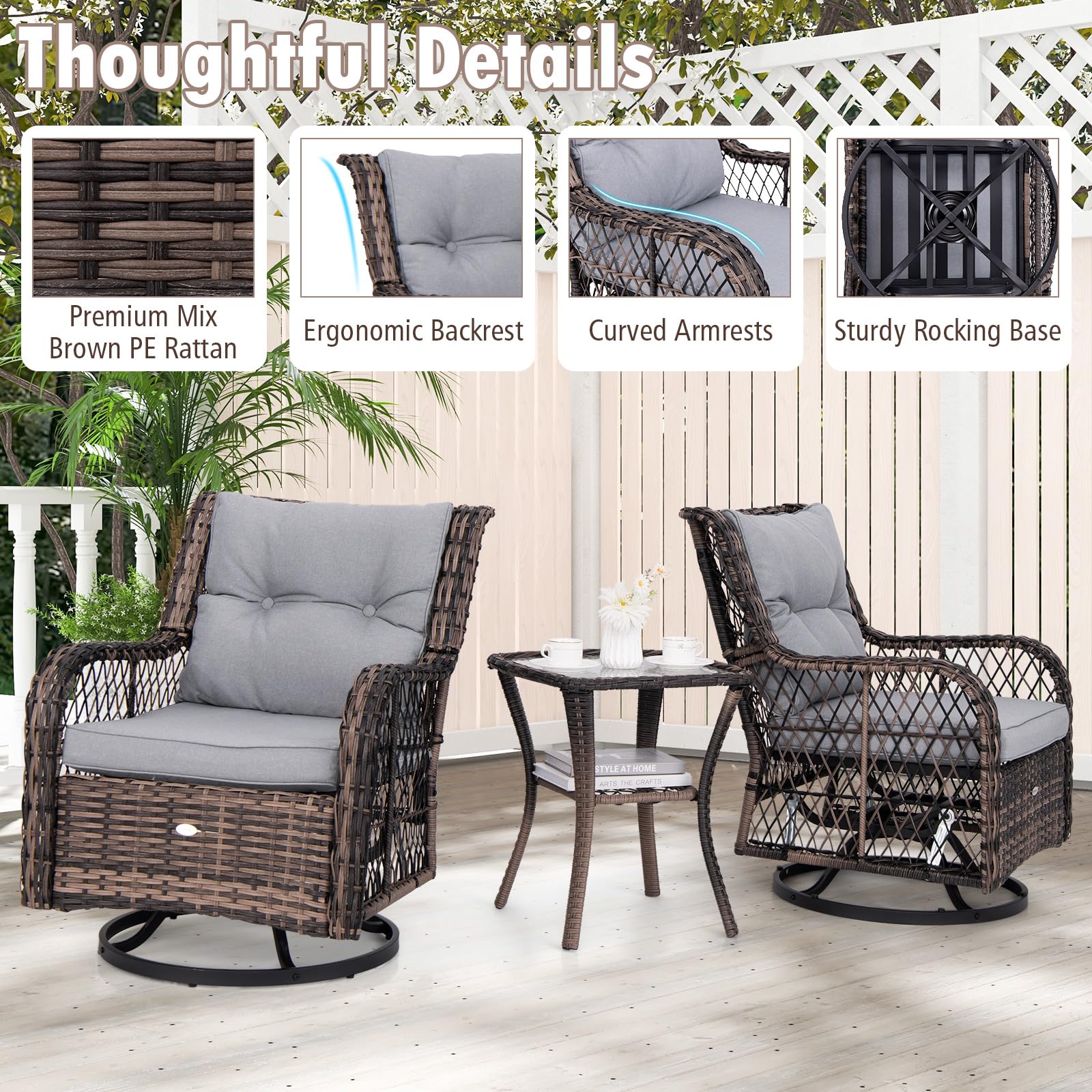 Tangkula 3 Pieces Outdoor Swivel Rocker Set, Rattan Wicker Patio Rocking Cushioned Chairs Set of 2 with Small Side Table