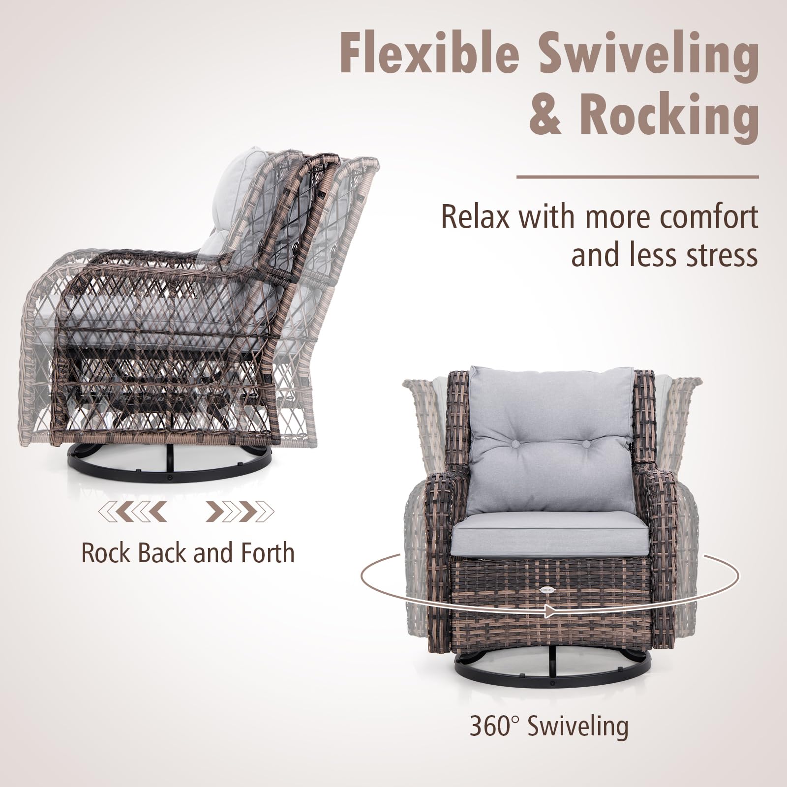 • Flexible Swiveling & Rocking: The 360° swiveling design of each rocking chair is perfect for taking in any view or engaging in conversations. Also, this patio set features gentle rocking mechanism, so you can relax with more comfort and less stress.