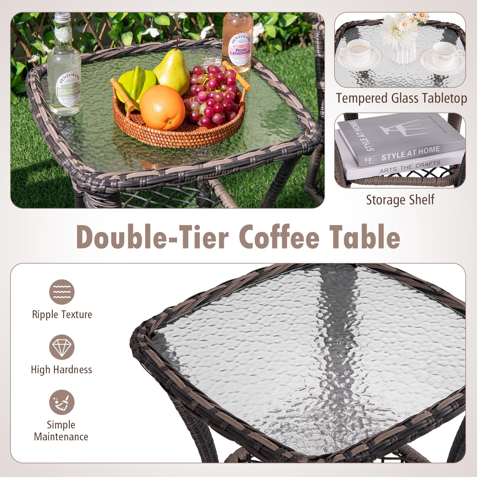 As a centerpiece of comfort, this set with 360° swiveling and rocking motion is ideal for unwinding and entertaining. Crafted with elegant and anti-fading woven wicker and complemented by elastic cushions, each chair will offer you optimal softness and coziness. Moreover, a double-tier coffee table with tempered glass tabletop offers both beauty and convenience. This patio swiveling rocking set will be a perfect addition to your backyard, poolside or balcony. Curate your own tranquil oasis for solitary moments or social gatherings.