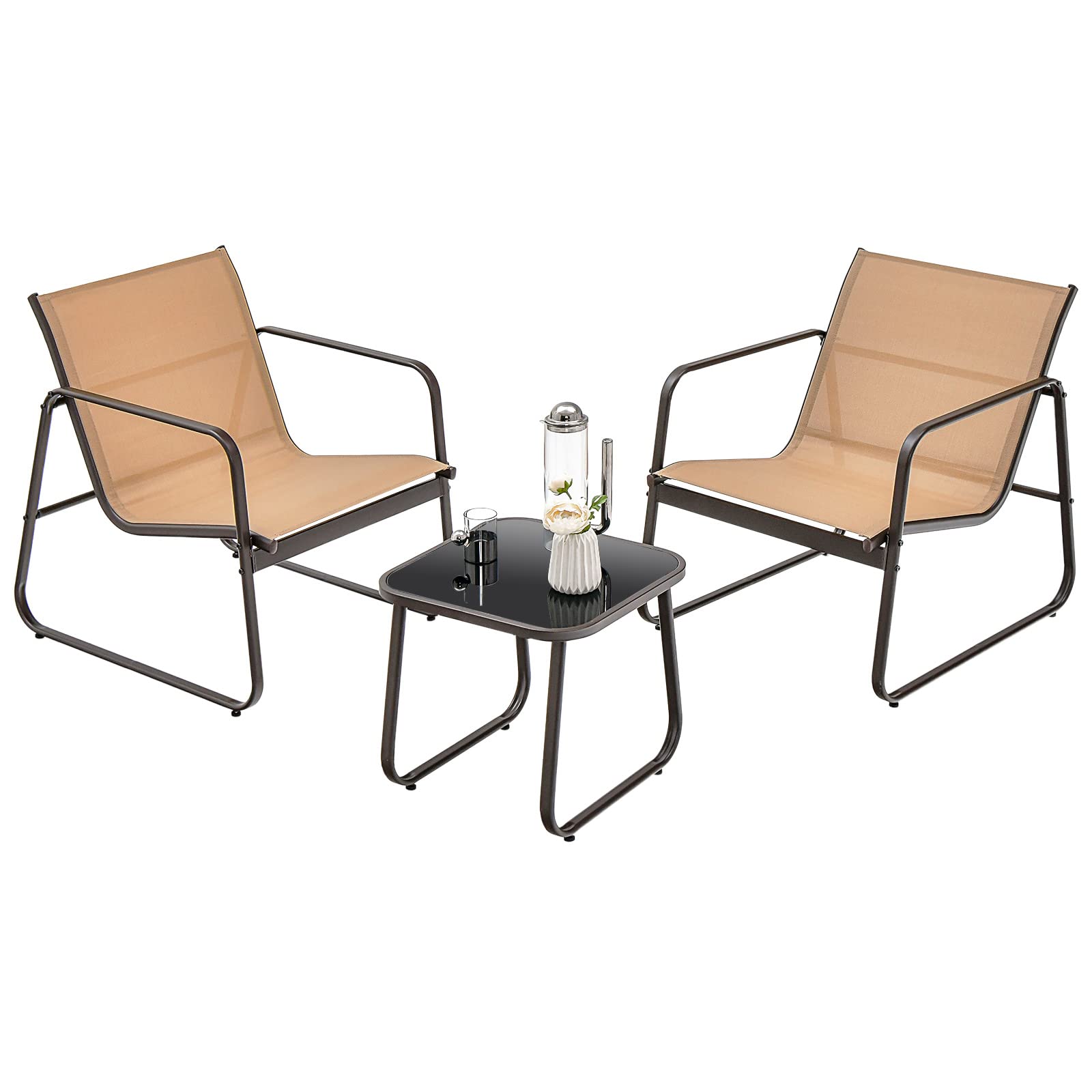 The ergonomic seat with breathable seat fabric makes you sit with more comfort and less hotness. And the heavy-duty metal frame ensures that the chairs are stable enough. The adjustable footpads also effectively prevent wobbling for higher stability. Moreover, the compact yet functional coffee table allows you to take drinks or snacks easily. And its tempered glass tabletop is quite simple to maintain. This 3-piece patio furniture set will be a nice addition to your backyard, poolside, and so on.