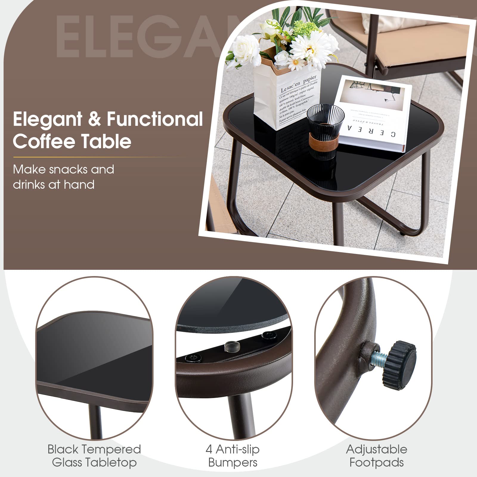 - Elegant & Functional Coffee Table: This patio set includes a practical coffee table, which can make snacks and drinks at hand. The black tempered glass tabletop is fixed by 4 anti-slip bumpers firmly, which is also easy to maintain. And the adjustable footpads make the table stand more stably.