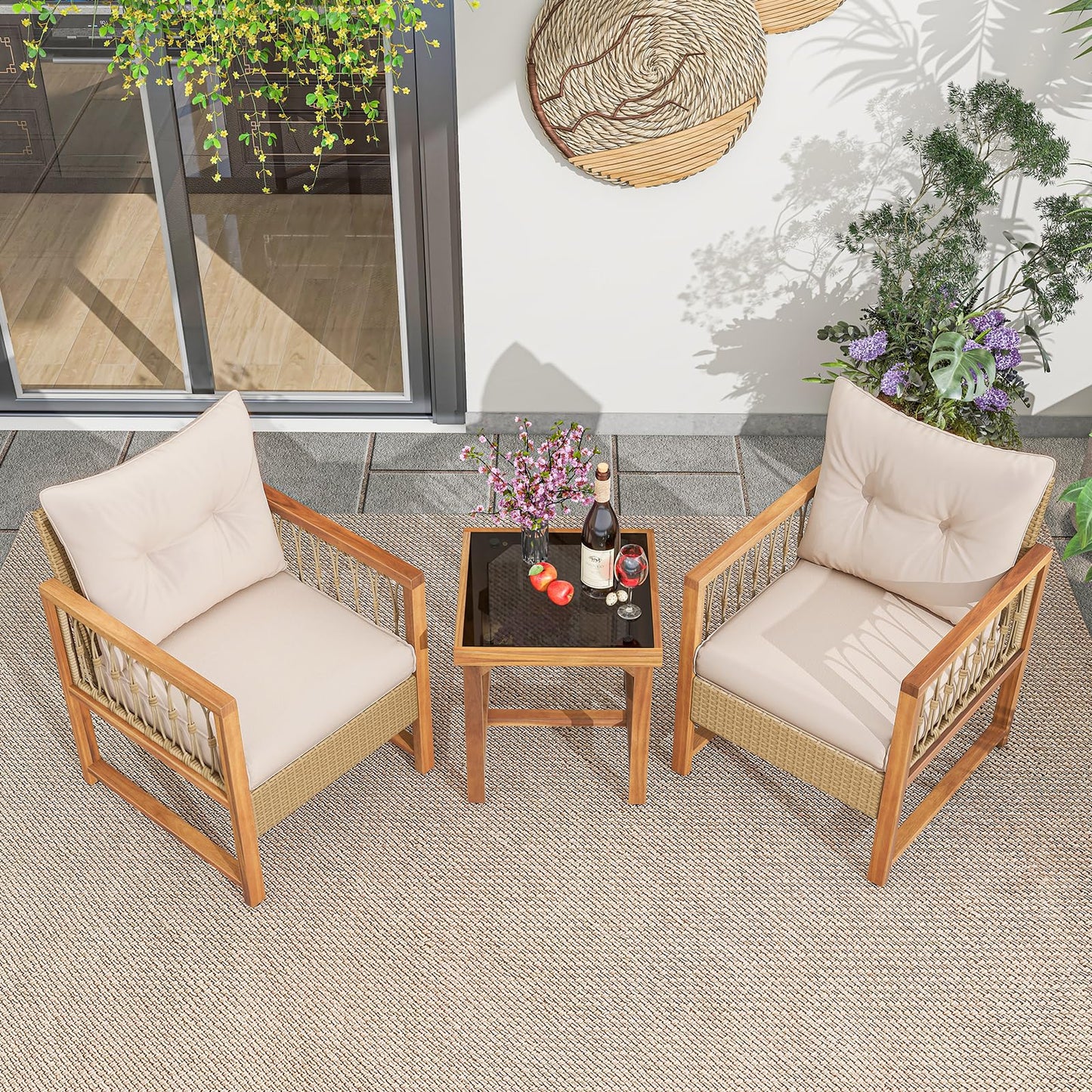 Tangkula 3 Pieces Patio Furniture Set, Outdoor PE Wicker Conversation Bistro Set with Acacia Wood Frame