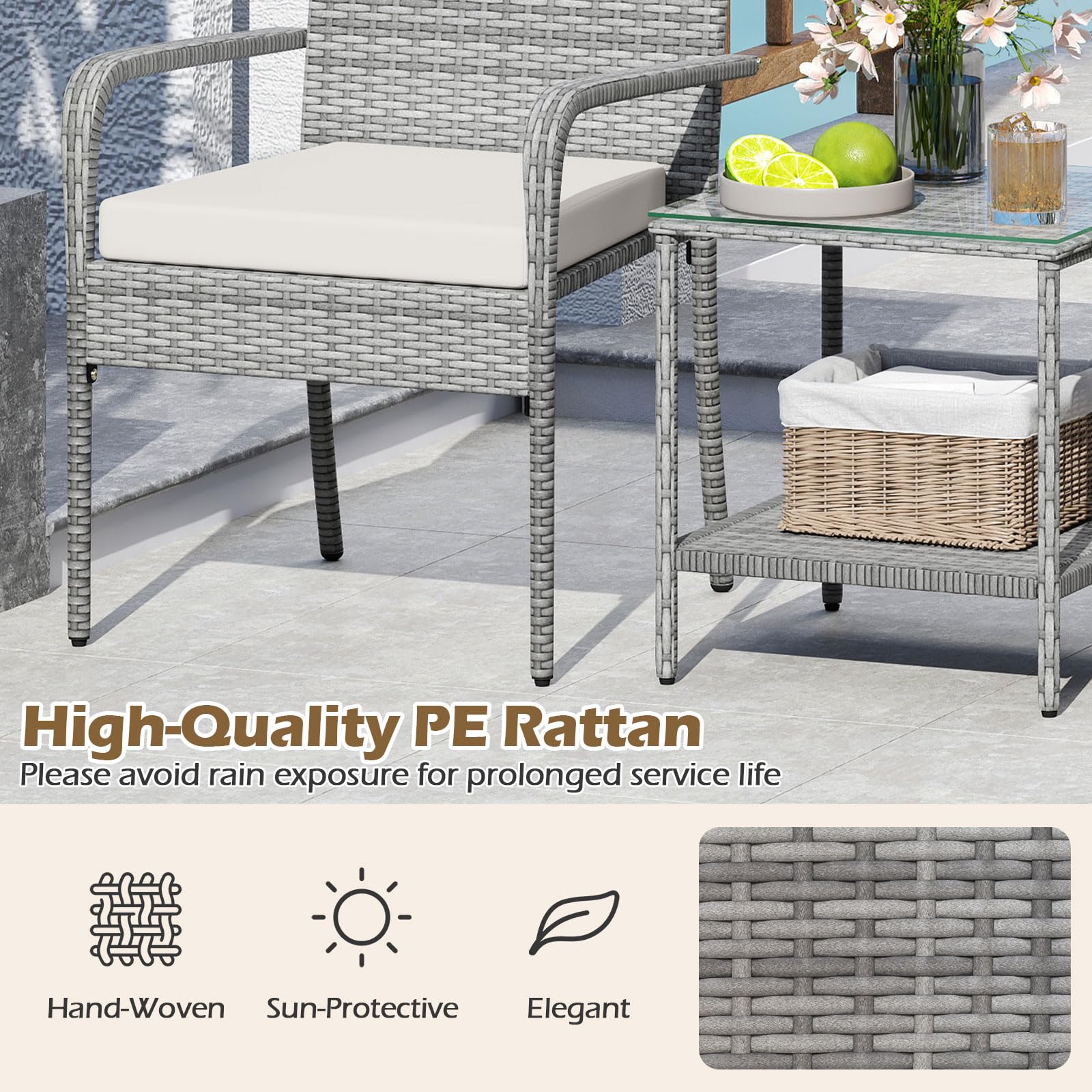 Crafted with premium PE rattan, this patio conversation set showcases a stylish appearance and ensuring durability. Both the table and chairs rest on a sturdy metal frame that promises exceptional stability, equipped with adjustable foot pads for extra stability. Designed for comfort, each chair features a sponge-filled cushion with smoothly zipping covers for easy maintenance. The balcony furniture set includes a 2-tier table for organized and accessible item storage. Perfect for various settings such as porches, gardens, or patios, this outdoor furniture set is a versatile choice for complementing your outdoor space.