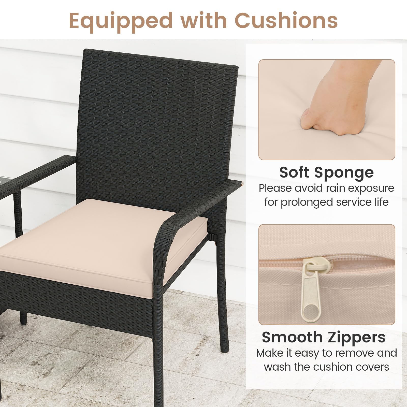 Crafted with premium PE rattan, this patio conversation set showcases a stylish appearance and ensuring durability. Both the table and chairs rest on a sturdy metal frame that promises exceptional stability, equipped with adjustable foot pads for extra stability. Designed for comfort, each chair features a sponge-filled cushion with smoothly zipping covers for easy maintenance. The balcony furniture set includes a 2-tier table for organized and accessible item storage. Perfect for various settings such as porches, gardens, or patios, this outdoor furniture set is a versatile choice for complementing your outdoor space.
