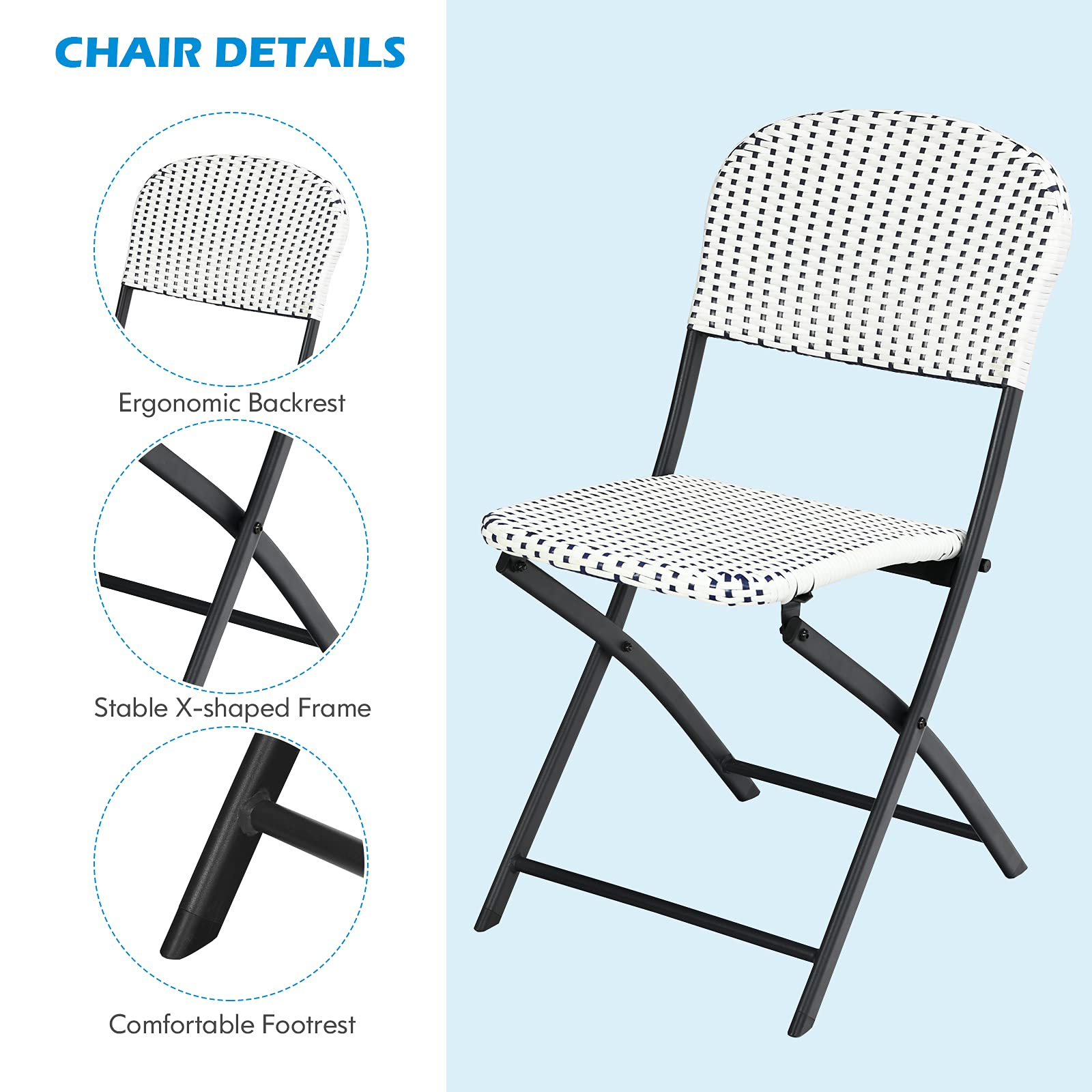 Our 3-piece rattan dining chair and table set include 1 folding dining table and 2 chairs, which will bring an elegant atmosphere to your patio or deck. The heavy-duty steel frame provides a solid foundation for this delightful dining set. Besides, durable PE rattan ensures long-lasting use and is suitable for outdoor use. Plus, X-shaped construction and 4 anti-slip foot pads provide adequate stability. With a folding design, this outdoor bistro set is convenient to store and transport. Furthermore, free installation design saves you time and effort.