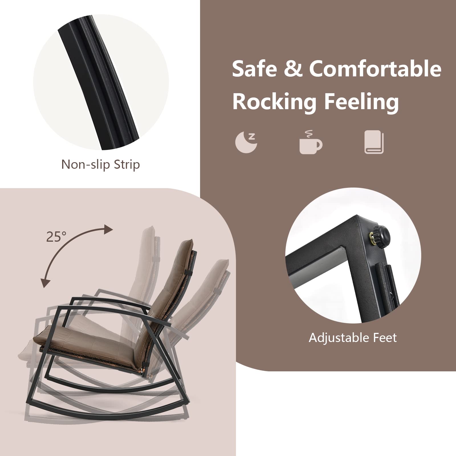 - Safe & Comfortable Rocking Feeling: Equipped with non-slip strips and adjustable feet, these patio chairs will provide you with a unique rocking experience while ensuring your safety. Besides, the high backrest and ergonomic armrests can relieve your fatigue for better support.
