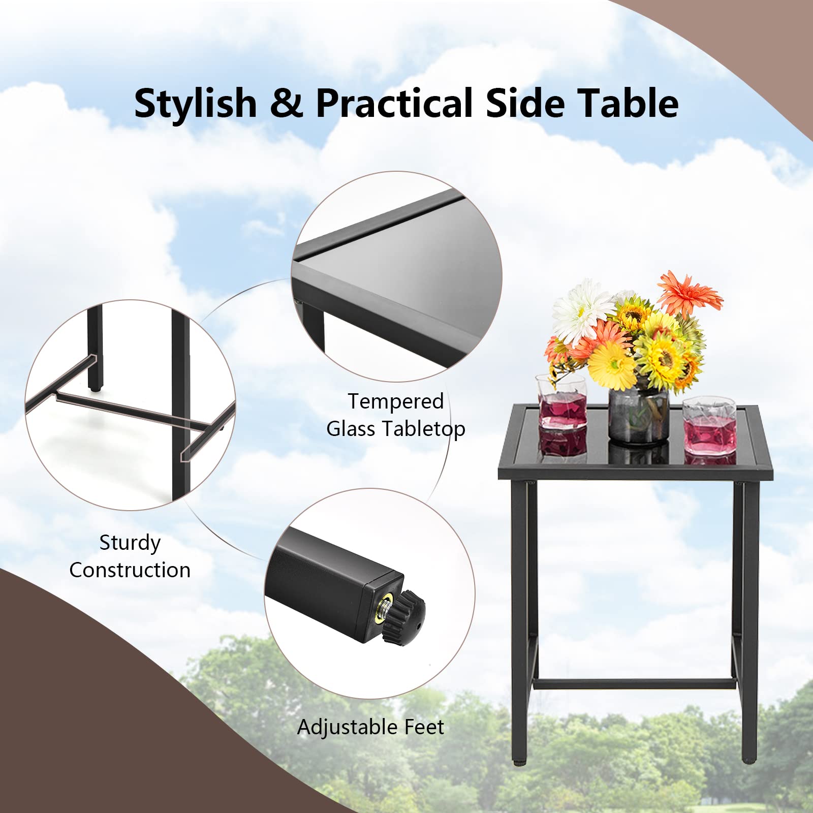 - Stylish & Practical Side Table: The patio furniture set comes with a compact side table, offering ample space for your snacks and drinks. The tempered glass tabletop features high strength and it is easy to clean. Moreover, the sturdy construction can hold up to 110 lbs. And the adjustable feet for added stability.
