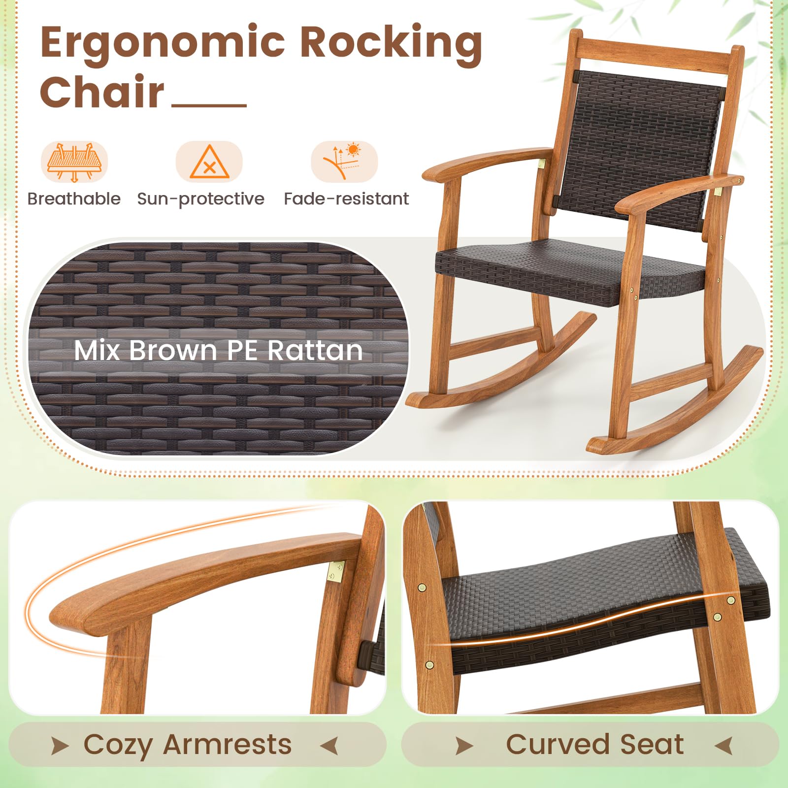 Our rocking chair set creates a comfortable place to enjoy leisure time and brings much pleasure to your outdoor life! Just rock slowly with our chairs and there is nothing better than that moment. Made of premium acacia wood and weather-resistant wicker rattan, this rocker set will serve you for long time. Besides, ergonomic backrest and armrest also add additional comfort to your body. Designed in rustic style, it is perfect to place the rocking chair set in outdoor or outdoor places, such as living room, patio, backyard and garden. Note: When it rains, the solid wood furniture set should be placed indoors to extend service life.