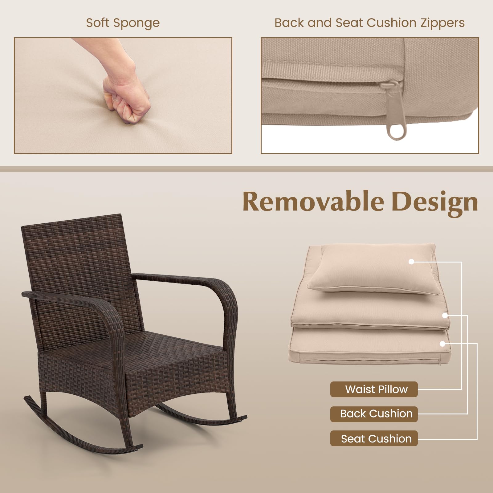 - Plush Pillows & Cushions: Each rattan rocker chair comes with a back cushion, waist pillow and seat cushion filled with soft sponge for superior comfort and support. Moreover, the zippers on the back and seat cushions allow for easy removal and maintenance.