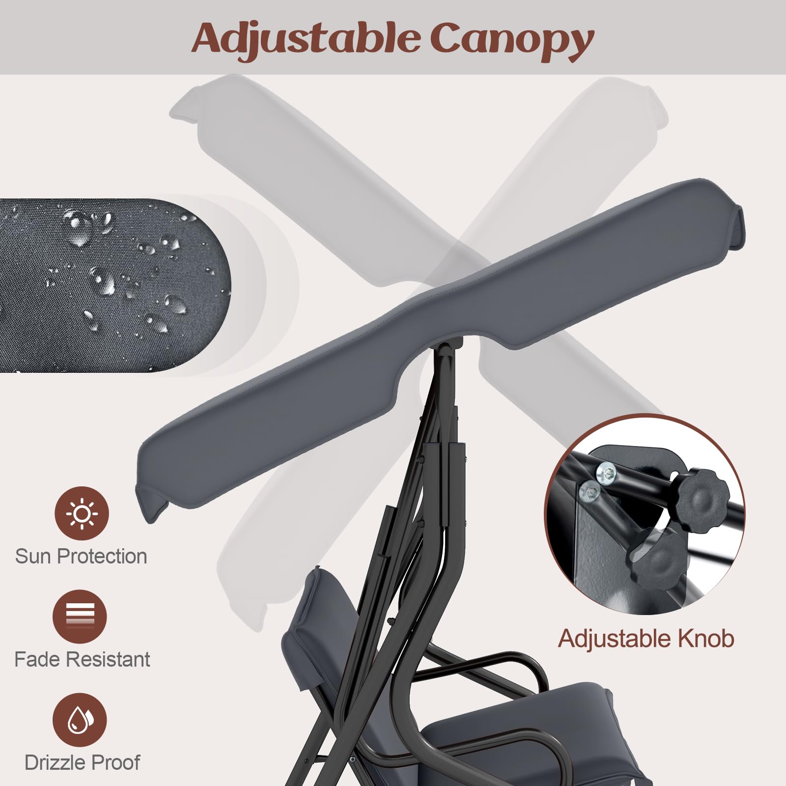 - ??Weather-resistant Fabric for Protection??: Thanks to the waterproof polyester & oxford cloth and the rust-resistant powder-coated finish, you can leave the swing outdoors after late-night barbecues or family gatherings without worry. Besides, the canopy can also protect you from harmful sunlight on hot summer days, ensuring a safe cool shade.