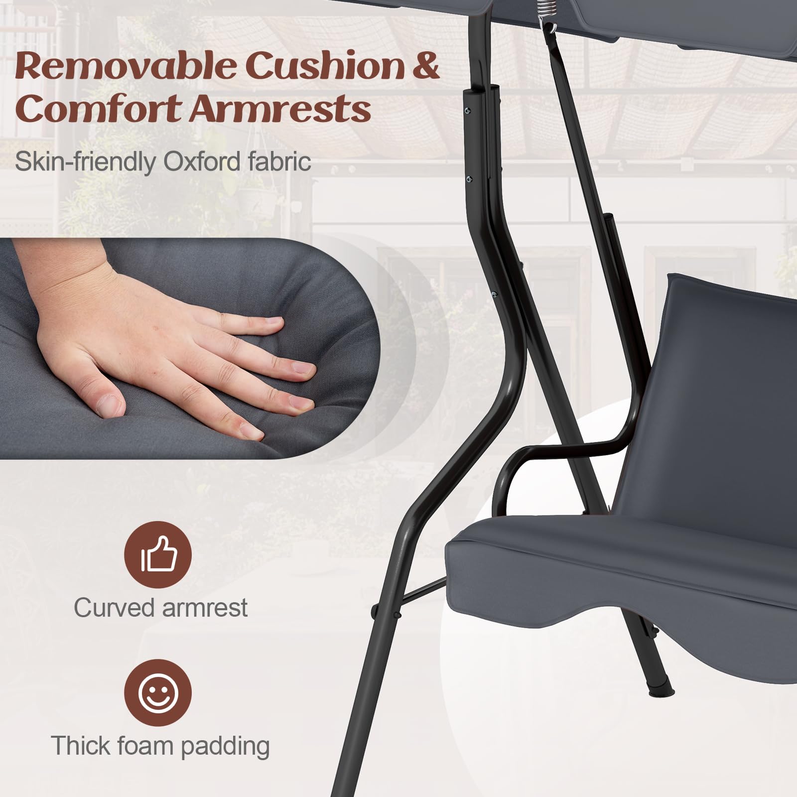 - ??Stable & Durable Construction??: This patio swing is made of a solid steel frame, which ensures strong weight capacity and sturdy construction. The powder-coated finish and polyester fabric provide better durability to support long-lasting use and enjoyment for you and your family.