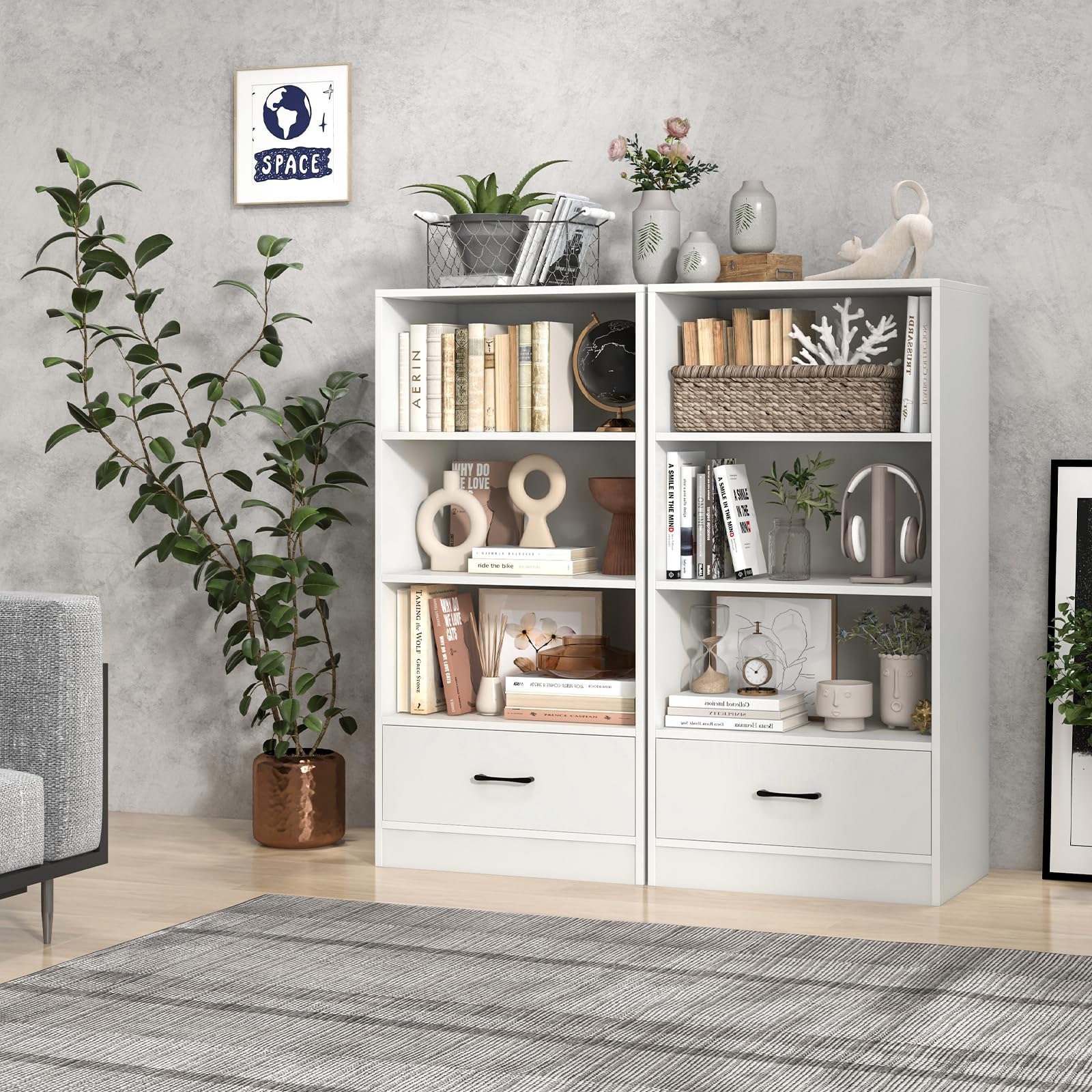 - [Detail Matters]: The storage drawer bookcase is fitted with premium metal slides and convenient handle for a smooth and quiet pull. At the base, there are protective foot pads that avoid scratching your hardwood floor while keeping excellent stability.