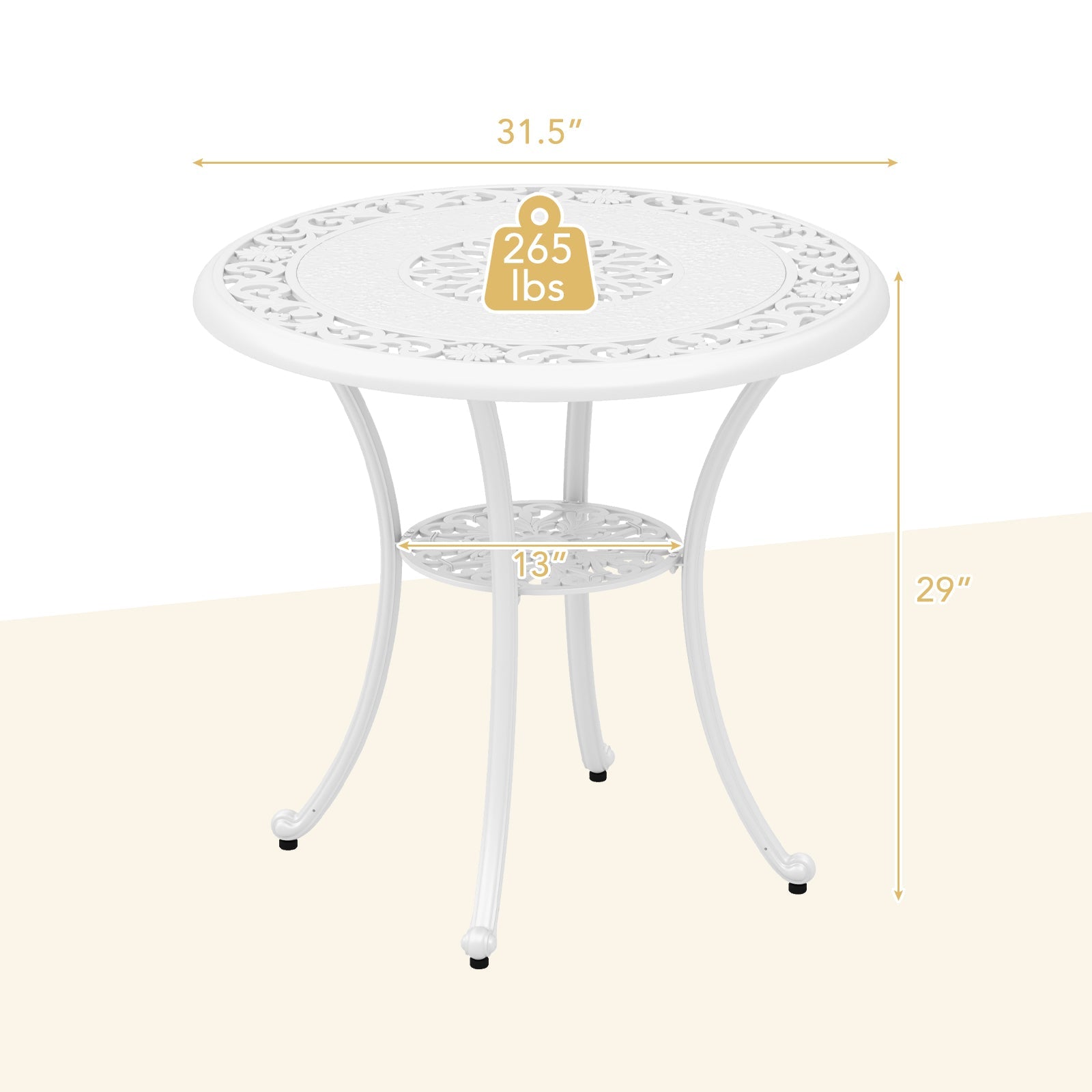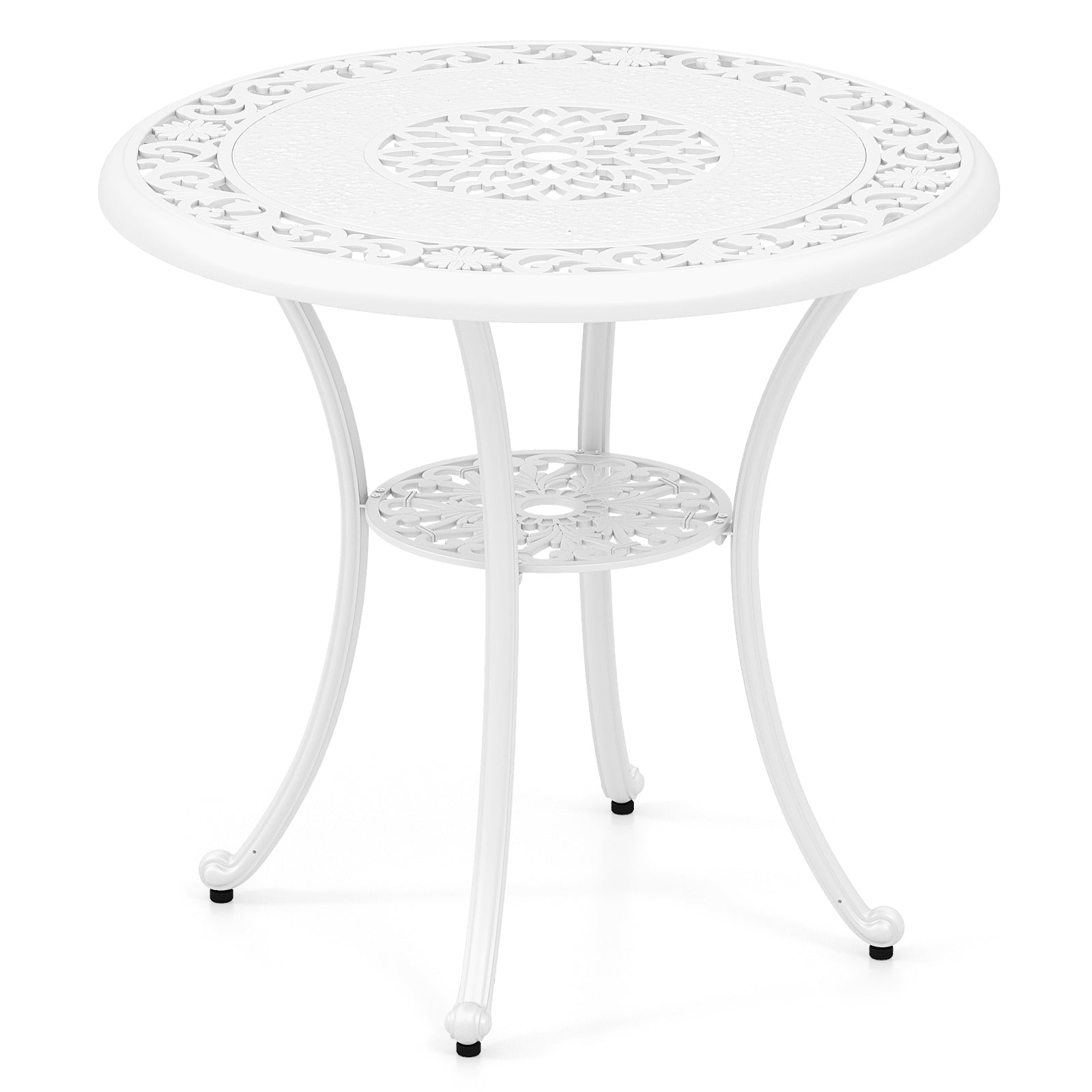Crafted from premium cast aluminum, the bistro table is weatherproof and anti-rust, making it?ideal for extended outdoor use. Its?beautiful floral patterns and elegant curved legs add sophistication to any setting.?The round outdoor dining table features a 2”?hole to accommodate a patio umbrella (not included), allowing you to?sip your favorite drink under the shade. A reinforced bottom structure adds stability and doubles as additional storage. Adjustable foot pads further ensure balance on uneven surfaces, making the outdoor bistro table?a versatile choice for any garden, patio, or poolside area.