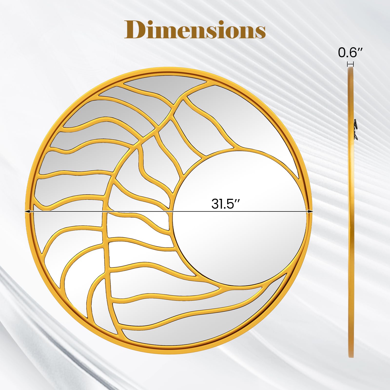 This 31.5" round gold wall mirror features an intriguing irregular frame, adding a touch of modern flair to any room. Whether you're looking to enhance your living room, bedroom, dining room, or entryway, this decorative mirror brings a bright and open feeling to the space. The sturdy MDF frame and backboard make the mirror more solid and not easy to break. Moreover, the clear image of this decorative mirror can provide an excellent visual experience. Equipped with 2 metal hooks and expansion screws, this wall mirror can be securely hung on the wall.