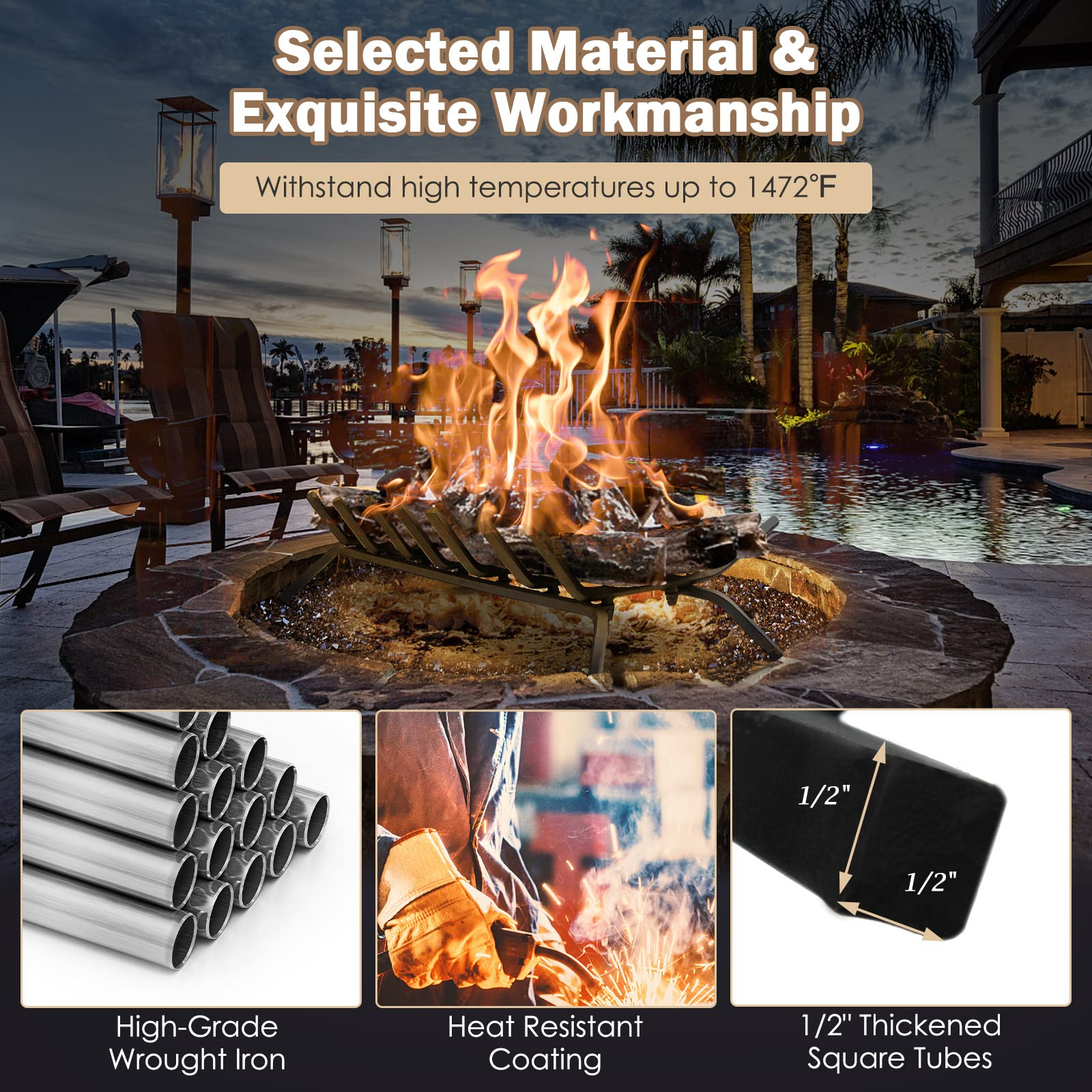 • Selected Material & Exquisite Workmanship: Crafted from high-grade and 1/2" thickened square wrought iron tubes with firm connection, this fireplace burning grate is stable and strong enough to hold the wood up to 110 lbs. Besides, featuring heat-resistant coating, the fire grate can withstand high temperatures up to 1473 Fahrenheit