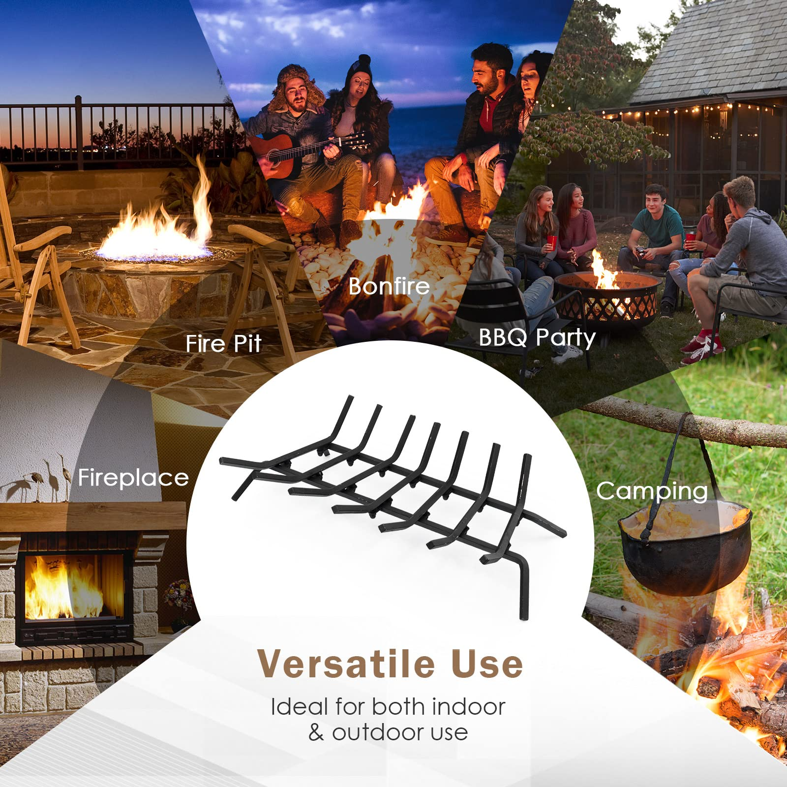 • Versatile Use & Compact Design: This heavy-duty steel firewood log grate is ideal for both indoor & outdoor use. With the perfect size and high heat resistance, it is suitable for your indoor chimney hearth, fireplace, outdoor fire pits, wood-burning stoves, bonfires, BBQ parties, camping, etc.