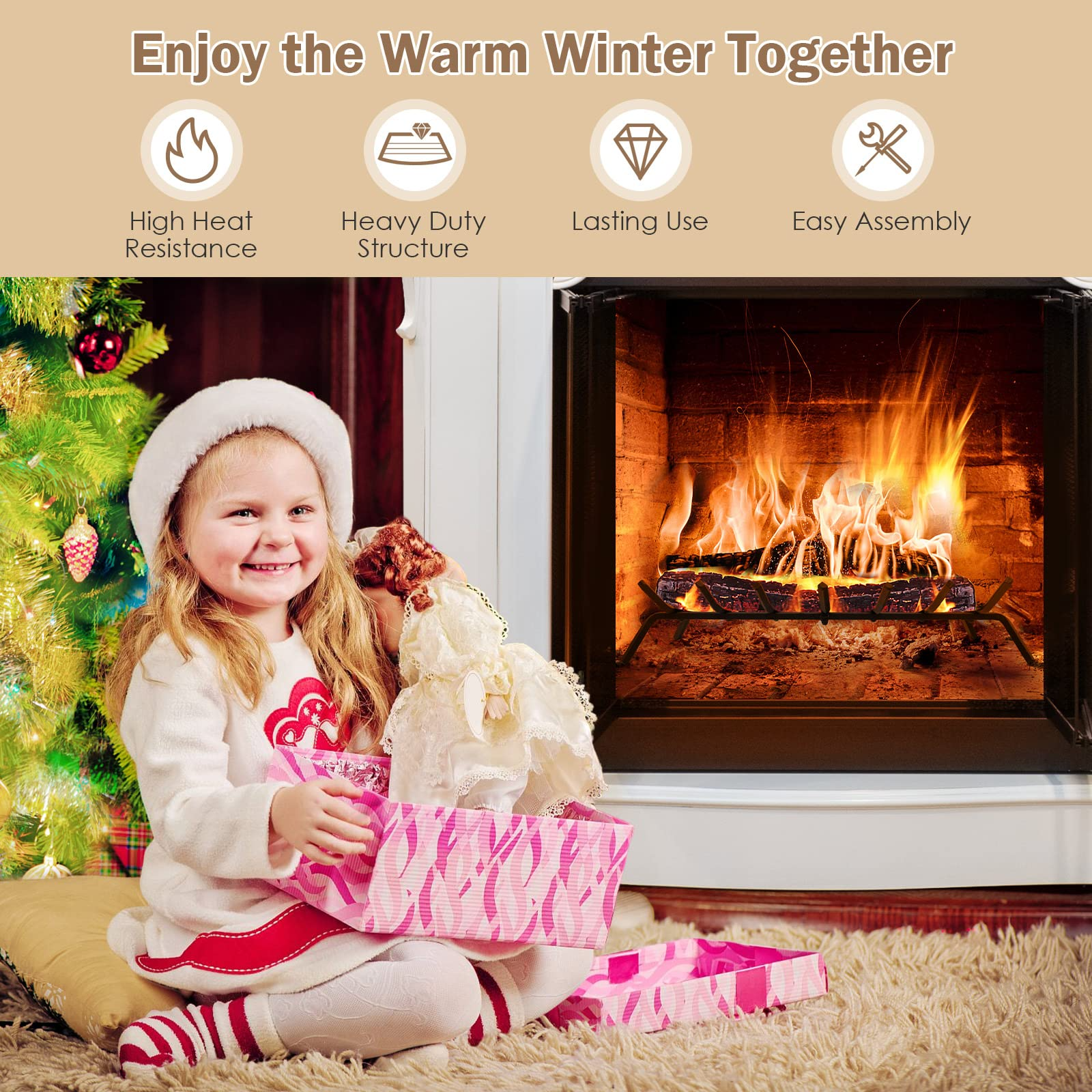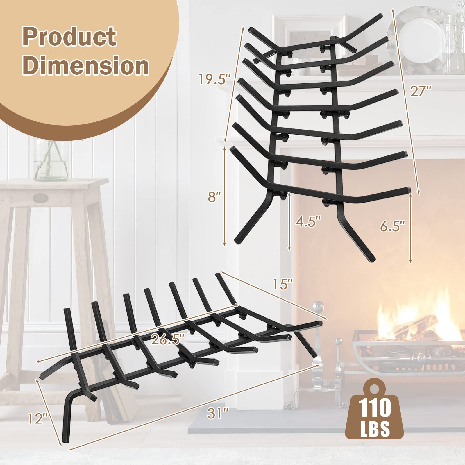 • High Clearance & Better Air Circulation: 4 sturdy and solid steel legs provide strong support to the entire firewood log holder. On the other hand, with a 4.6" high clearance from the ground, this wrought iron fireplace grate allows for better air circulation and keeps the fire strong and lasting even after the ashes start to accumulate.