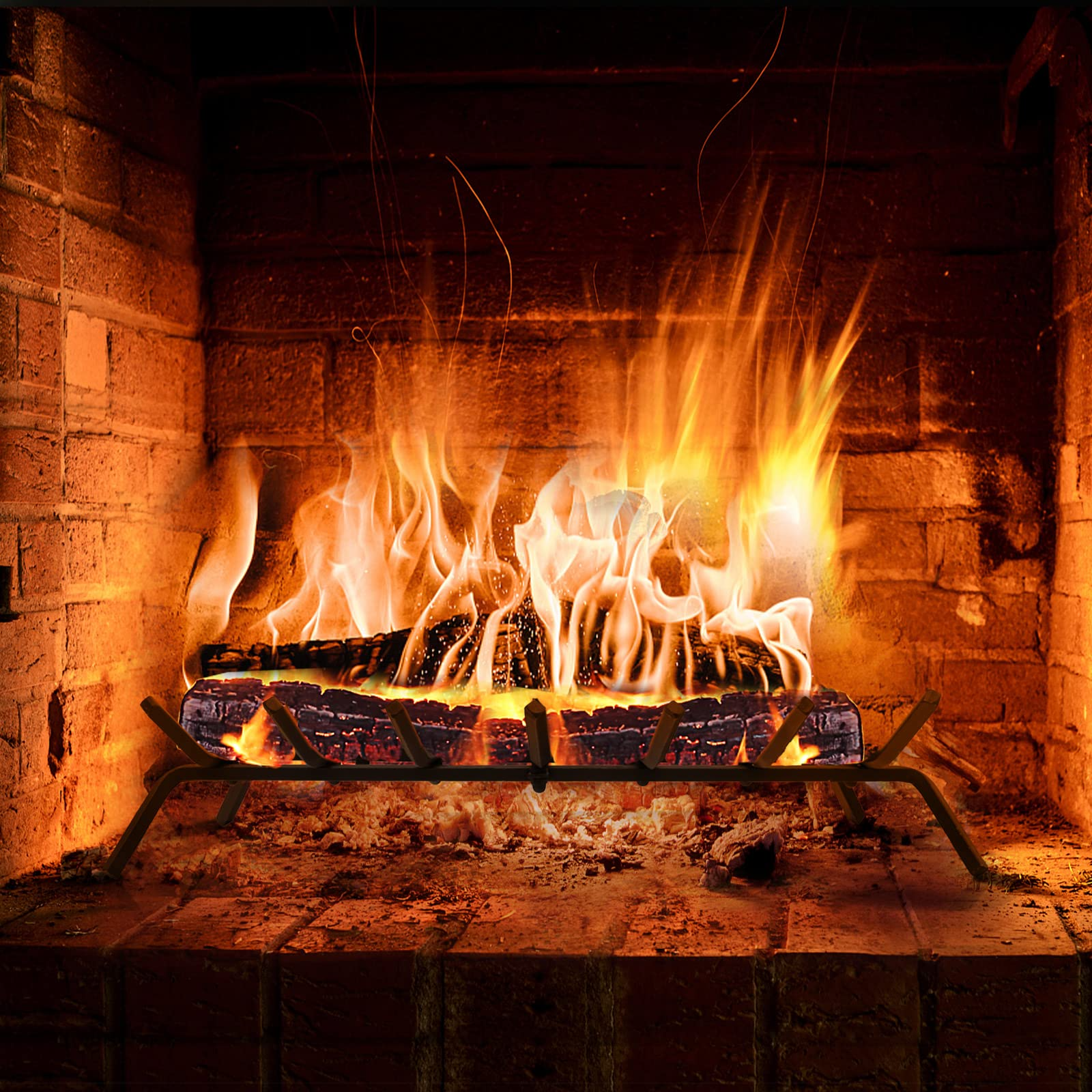 This fire grate is made of thick and solid 1/2" wrought iron bar rods with a high-temperature resistant finish, ensuring great sturdiness and long-lasting use. 4 sturdy supporting legs prevent the fireplace grate from collapsing due to heat and the weight of the firewood. Besides, the raised bottom design and slatted bars help maximize the airflow for more complete and longer burning. And the V-shaped design prevents the firewood from rolling out of the grate. This multipurpose fire grate is perfect for indoor and outdoor use, such as in backyards, patios, decks, fireplaces, chimneys, fire pits, etc