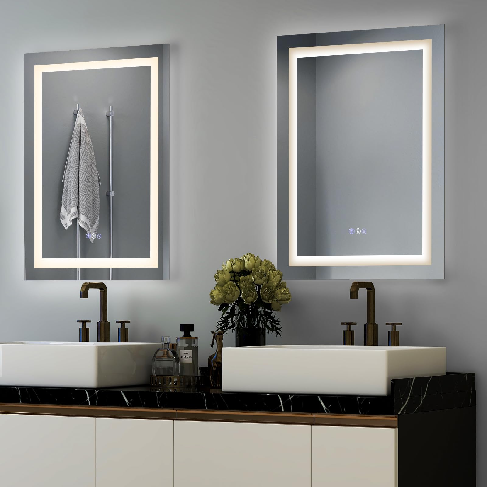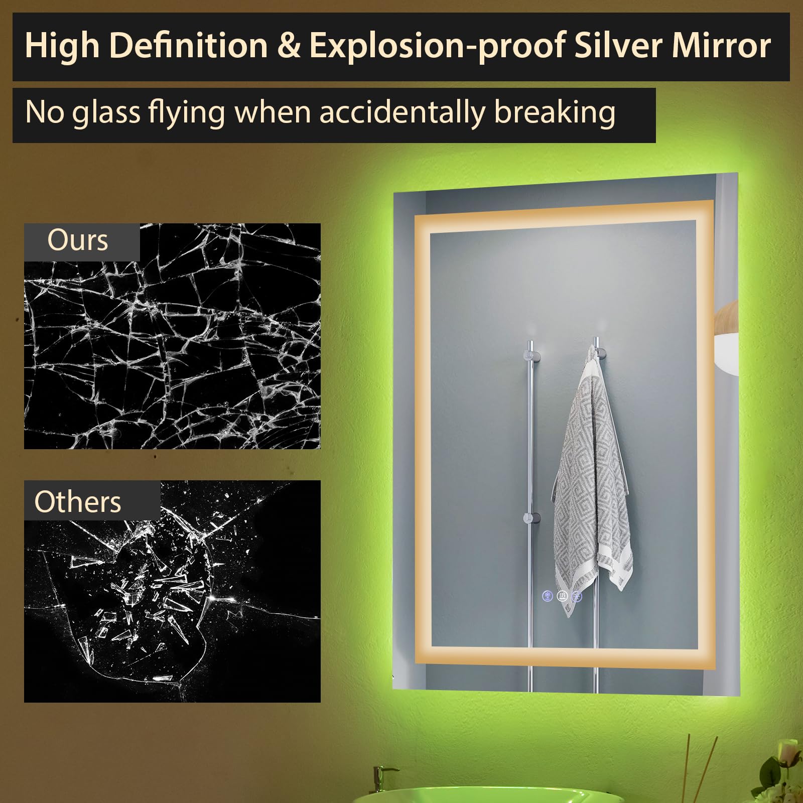 - ADJUSTABLE FRONTLIT & RGB BACKLIT: This lighted bathroom mirror provides you with multiple color selections. There are 3 light modes for front light: cold light 6000K/white light 4500K/warm light 3000K and 8 light modes for backlight: cold/white/warm/colorful/pink/red/green/blue.