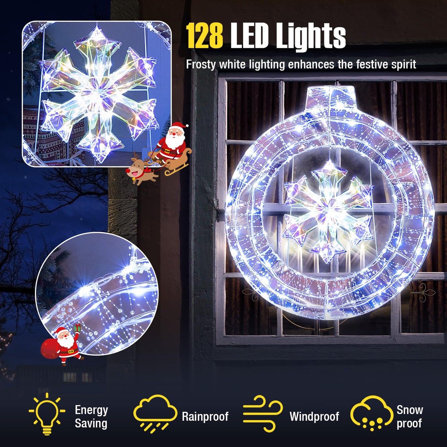 Surrounded by 128 energy-saving LED lights, the decorative wreath casts a soft, frosty glow, enhancing the holiday spirit. Made from weather-resistant materials, this wreath is rainproof, windproof and snowproof, ensuring your festive display remains radiant. With a hanging ring and support bracket, it is versatile for both wall and floor placements. Embrace the joy of the season with such a perfect for Christmas wreath, ready to create a warm and welcoming atmosphere in your home.