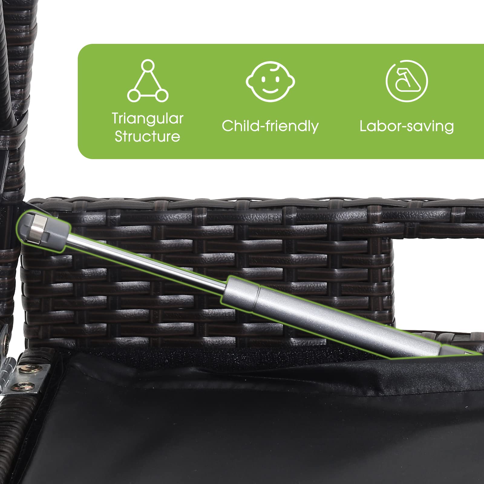 With 34 gallon capacity, this outdoor storage container features large storage space to accommodate different items. And the waterproof zippered liner protects them from rain and dust for all-around protection. Vary from common boxes which feature unsafe metal chains, our storage container is equipped with safe gas struts that are labor-saving and child-friendly. And the triangular structures make them more stable. What's more, our storage bin is designed with soft and removable cushions, providing a more comfortable sitting experience than those without cushions. In addition, this outdoor storage box is made of colorfast PE wicker and a rustproof metal frame for a longer outdoor service time.
