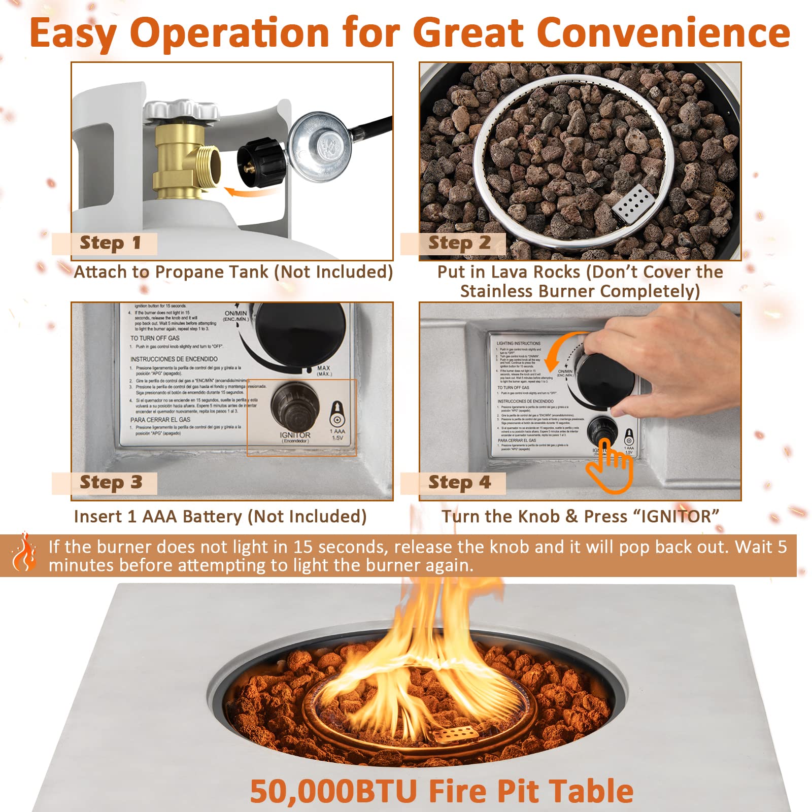 • 2-in-1 Convertible Design: Designed with a removable metal lid, this concrete propane fire pit table can not only serve as a 50,000BTU fire pit table but also acts as an outdoor coffee table. With this design, the product can provide versatility and satisfy the various needs of our customers as the season changes.