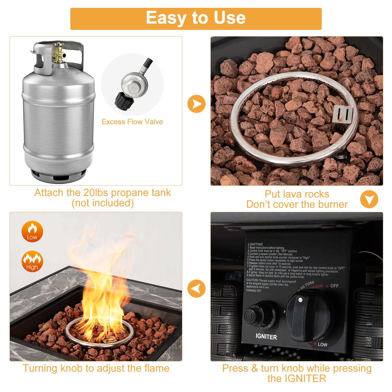 • Perfect for Year-round Use: Our ETL & CSA certified gas fire pit table features 50,000 BTU heat output, giving you enough warmth on cold days. Made of weather-resistant PE rattan and powder-coated steel frame, this outdoor fire pit table is durable enough to be used in the courtyard, balcony, poolside, garden, and more.