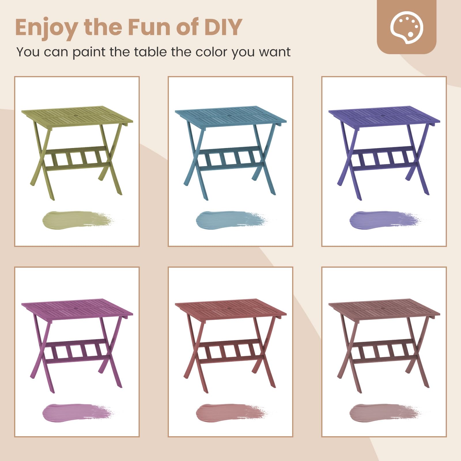 Constructed with natural and robust acacia wood, this foldable bistro table not only exudes charm but also offers long-lasting durability. For those sunny days, there is a 1.97" diameter hole in the center of the table to accommodate an umbrella. Stability is enhanced thanks to X-shaped supports and multiple crossbars. You have the option to personalize wood outdoor dining table by painting it in your favorite color, adding a unique touch to your outdoor settings, such as porch, garden, or backyard. Additionally, this acacia wood folding patio table can easily be folded up for space efficiency and easy mobility.