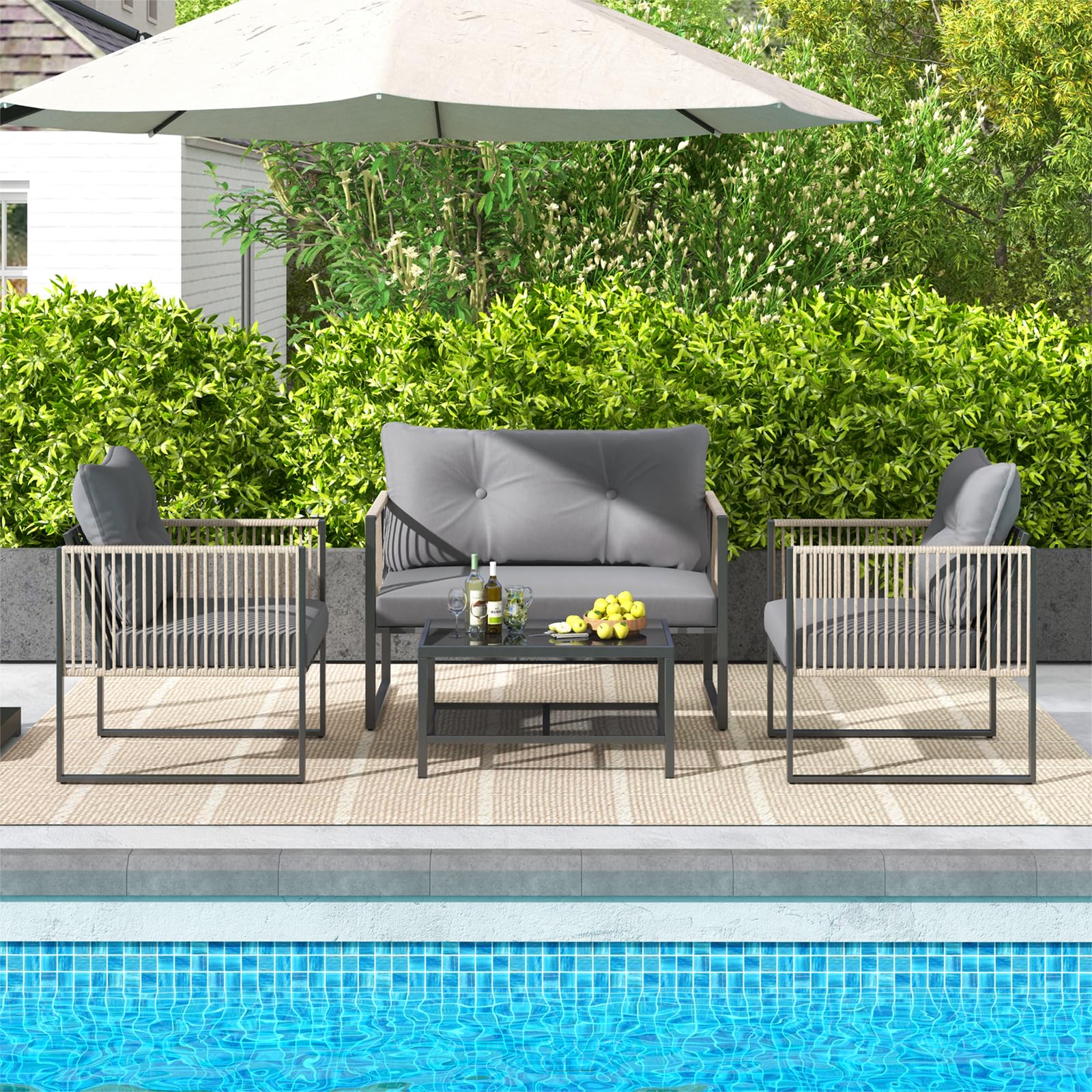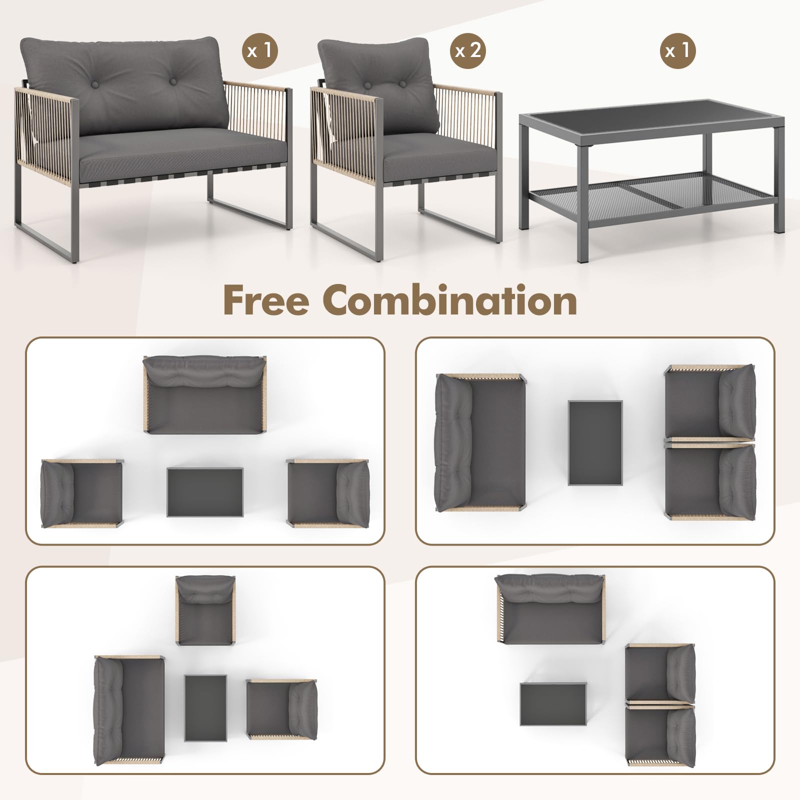 - 2-tier Coffee Table: This patio set includes a rectangular coffee table with a high-quality tempered glass top that adds a touch of elegance and is easy to clean. The 2-tier design provides ample space for your snacks, books and decorative items.