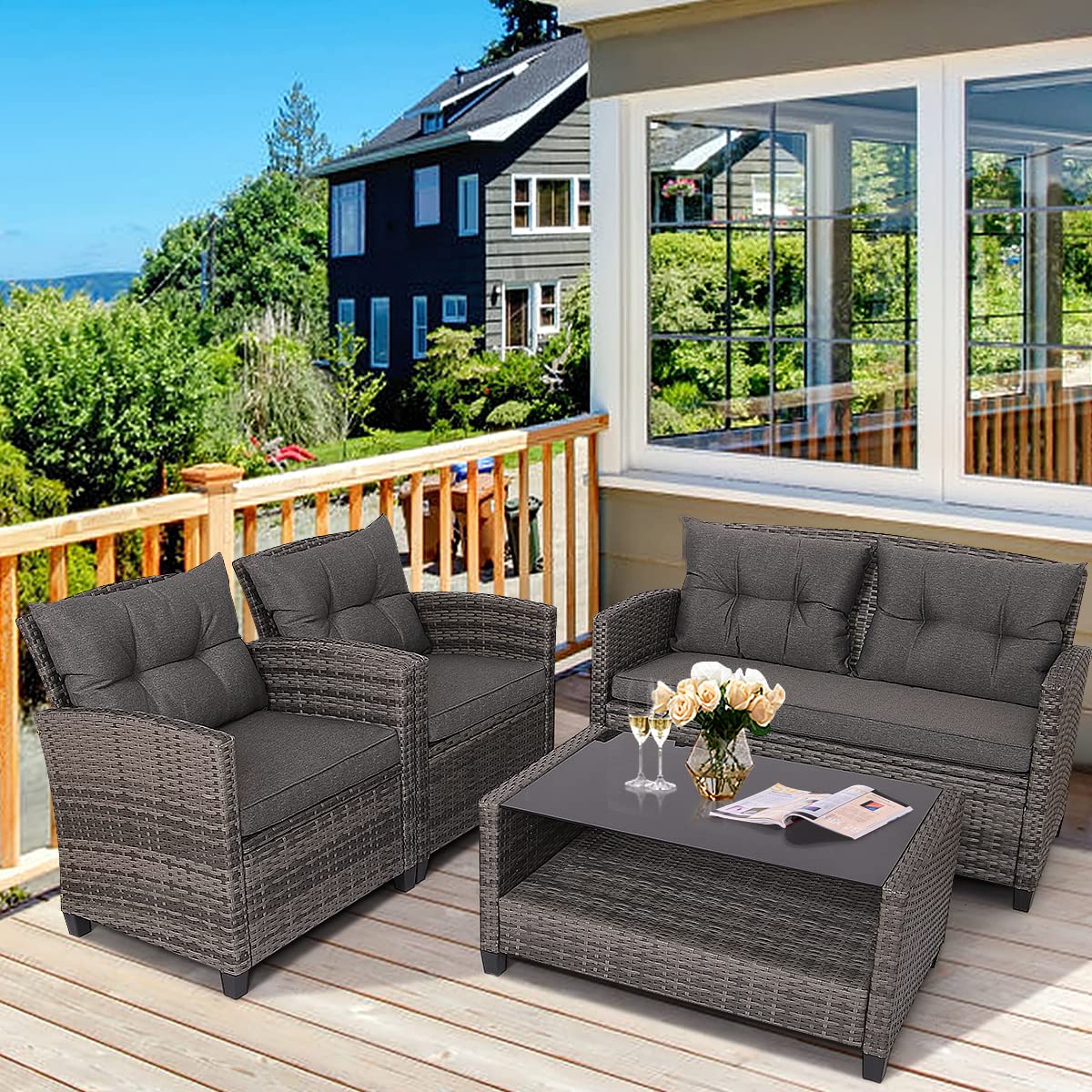 It's time to replace the outmoded outdoor furniture with our modern 4-piece patio wicker sofa and table set. Sturdy and solid steel frame with all weather PE rattan can keep stability and durability for long time use. Breathable and soft cushions will hold you comfortably and the cover of cushion can be removed with smooth zipper. Featuring with 1 coffee table, 1 loveseat and 2 single sofas, this patio furniture set can be combined in various ways according to your different needs. Moreover, the simple and stylish design enables you to put this sofa set in any place you want. So make this furniture set yours and be sure to share the best of times with your dear ones.