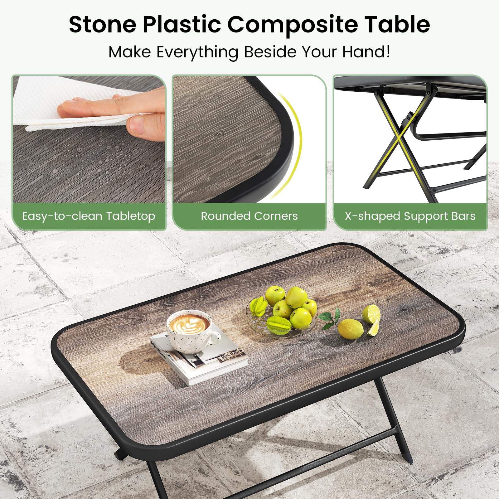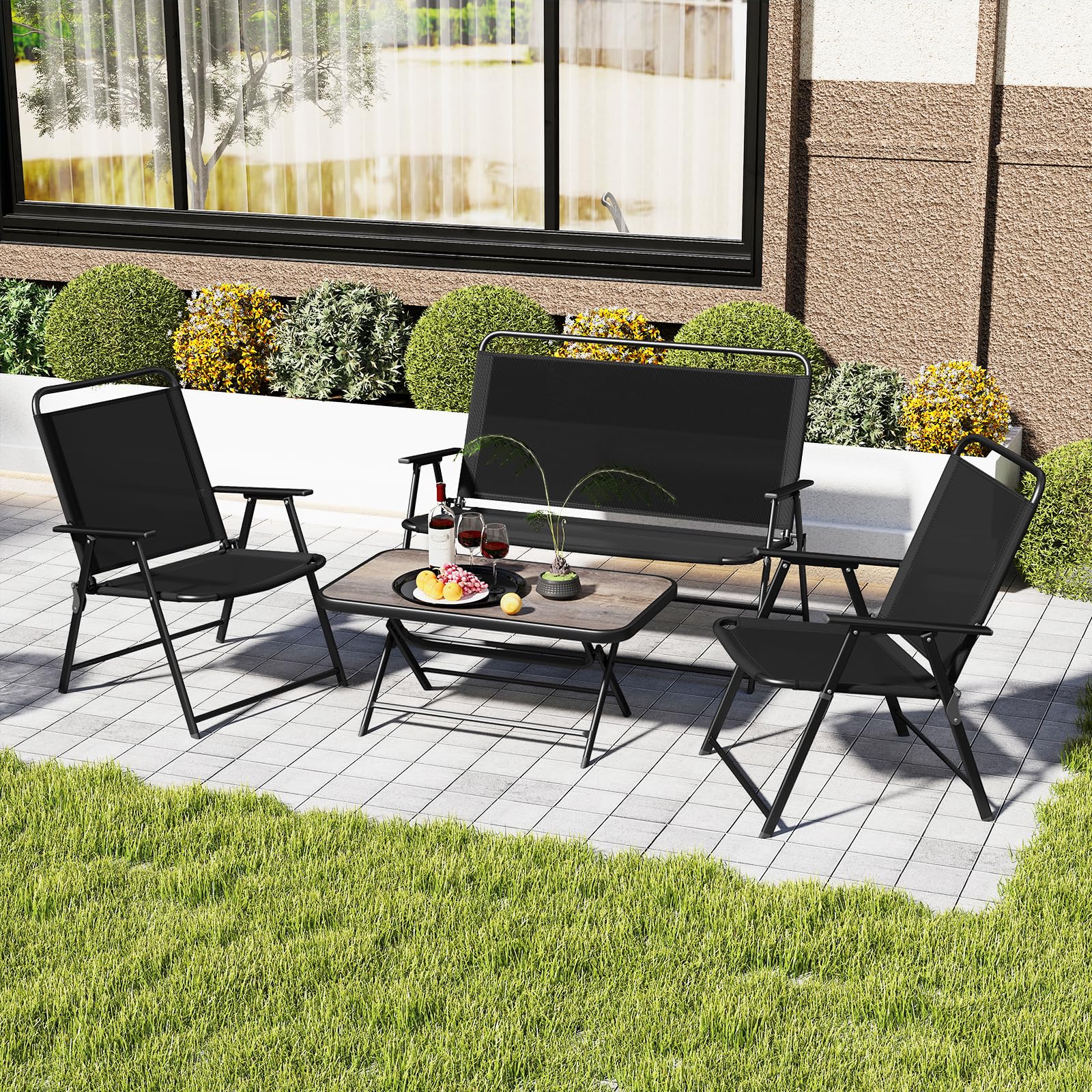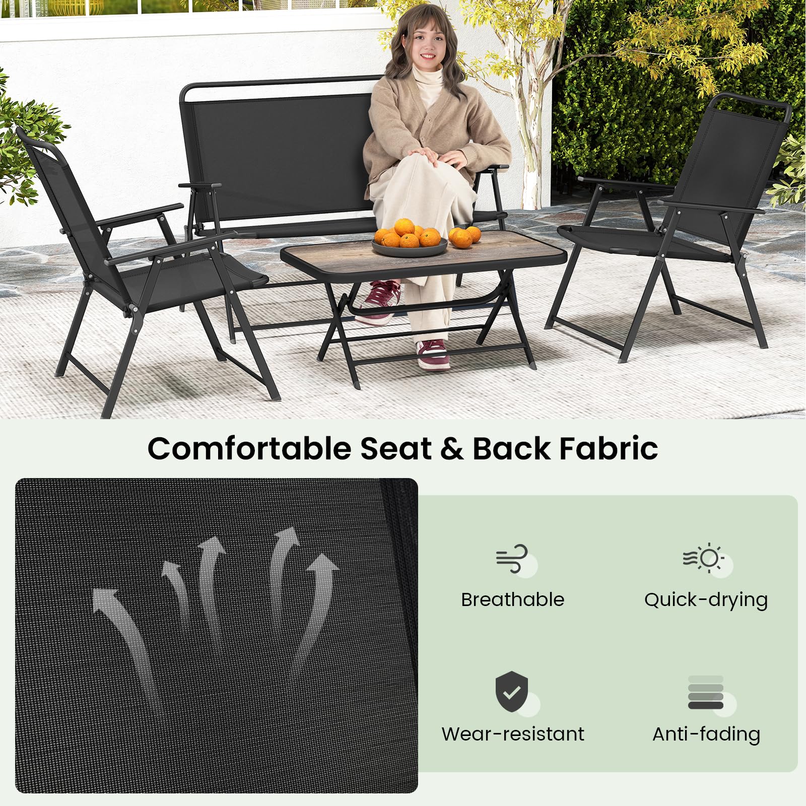 The 4 piece outdoor conversation set is a versatile and efficient addition to your outdoor space. Designed with space-saving in mind, each piece of this patio set easily folds for convenient storage and transportation. Crafted with breathable and quick-drying fabric, this patio furniture set ensures a comfortable seating experience while keeping you cool on hot days. The high-quality fabric also boasts quick-drying properties for effortless maintenance. The reinforced metal structure provides sturdy and reliable seating for all users. This 4-piece patio conversation set includes a rectangular coffee table, a cozy loveseat, and 2 patio chairs, offering versatility in arrangement to suit any gathering or outdoor space.