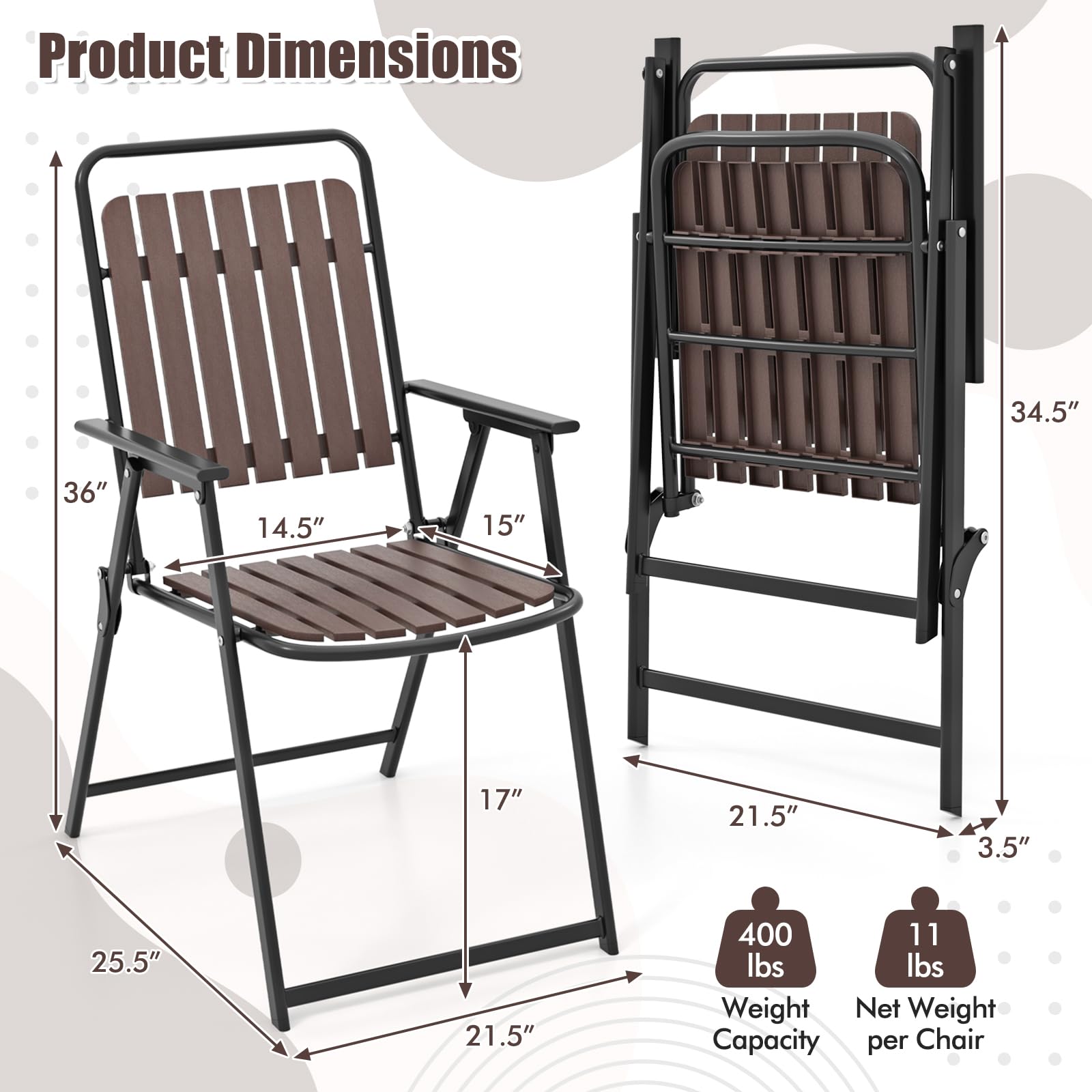 - Simple to Store & Transport: With quick-folding design, the chairs with compact folding size are space-saving to store. Each chair weighs only 11 lbs, which is also quite easy to carry anywhere you want.