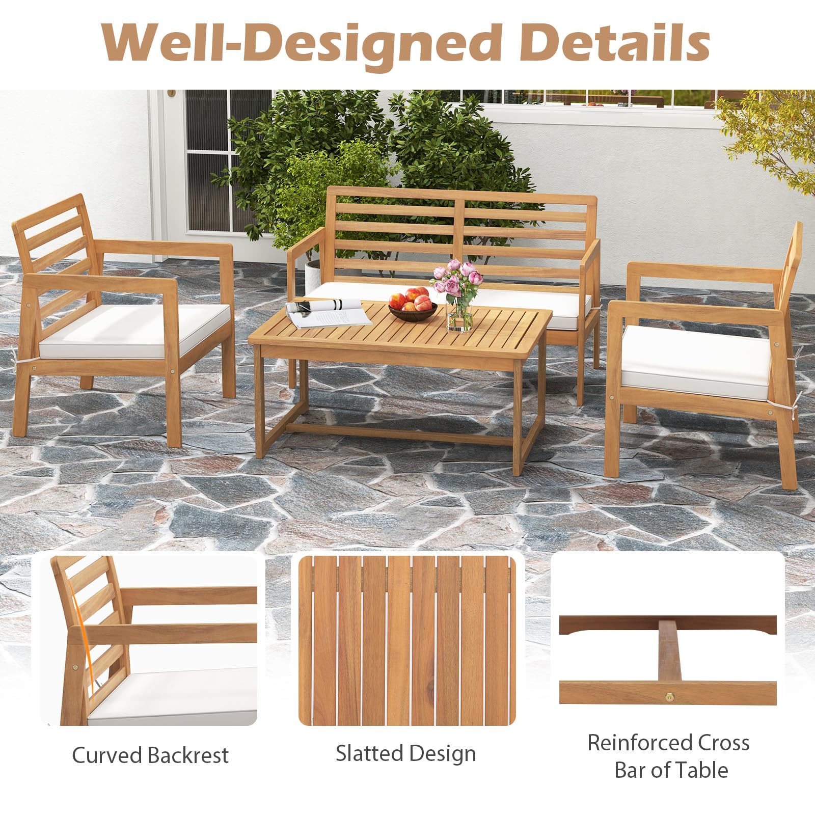 - Well-Crafted Acacia Wood: The main material of this patio furniture set is selected acacia wood which is anti-crack and natural, making the whole set sturdy and elegant. The wood frame also boasts a splinter-free and smooth surface.