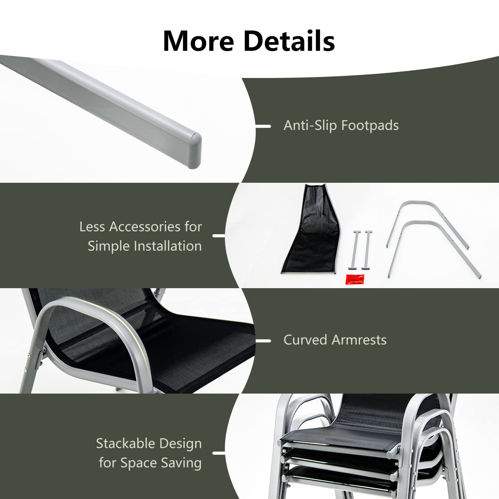 - Patio Chairs Stackable Set of 4: These 4 pieces patio dining chairs can be stacked in a vertical shape that is designed for space-saving. And easy to move here to there since the lightweight design.
