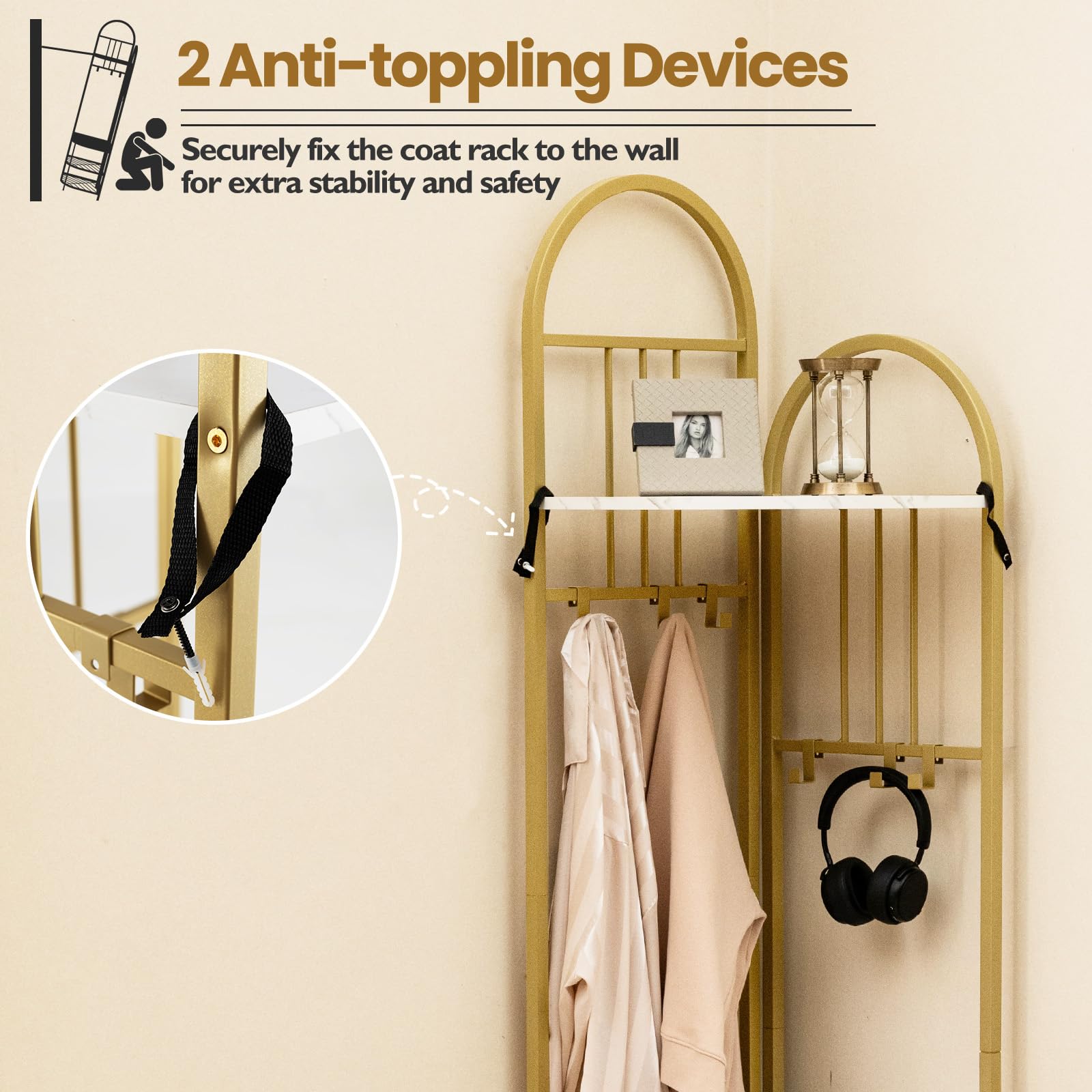 Optimize your living area with our hall tree that fits snugly in any corner, maximizing space while providing ample storage. The tall entryway shoes shelf organizer rises above the bench, offering additional storage and display options. Besides, 6 removable hooks allow you to hang multiple coats and hats. Below, a shoe storage bench provides an organized area to keep footwear neatly arranged and easily accessible. Along with the sturdy metal frame, the tall coat rack has anti-toppling kits for stability and adjustable foot pads to keep it balanced on uneven floors. The freestanding clothes rack fits seamlessly into various home settings, such as living room, bedroom, and hallway.