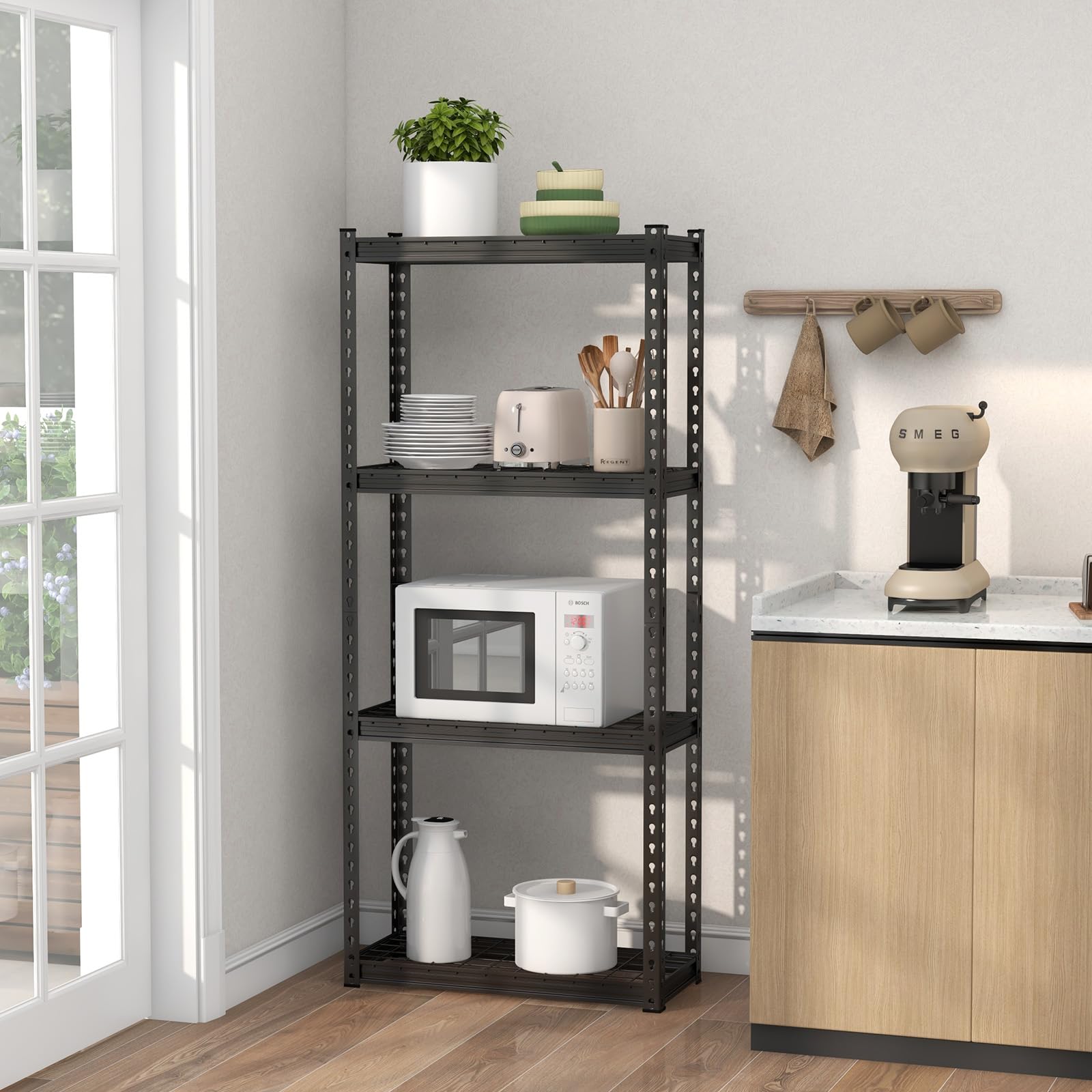 - Large Capacity & Versatile Use: This 4-tier metal storage shelving provides massive storage space for your items, like tools, kitchenware, books, plants and more. Taking advantage of vertical space, the rack will be a perfect storage solution for your garage, kitchen, pantry, basement, etc.